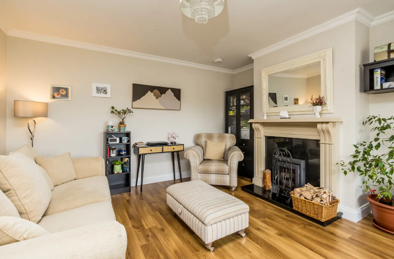 Sitting Room 5.12 x 4.46m Insert wood burning stove. Timber floor, Coving, West facing to see the sun set.