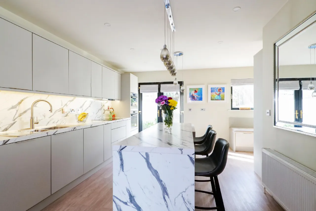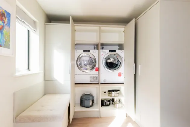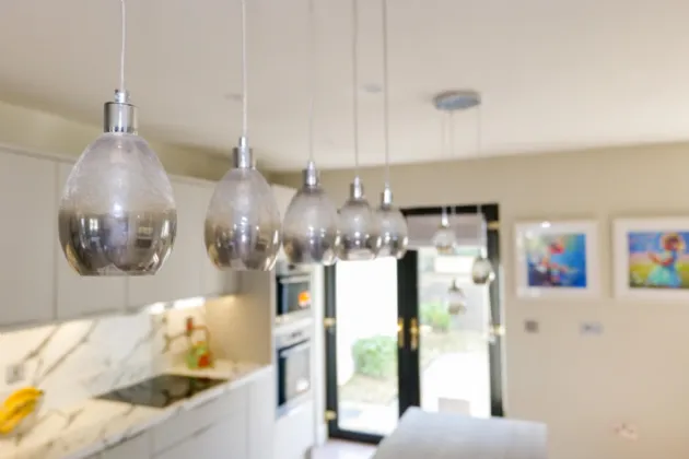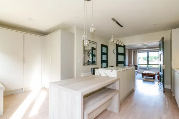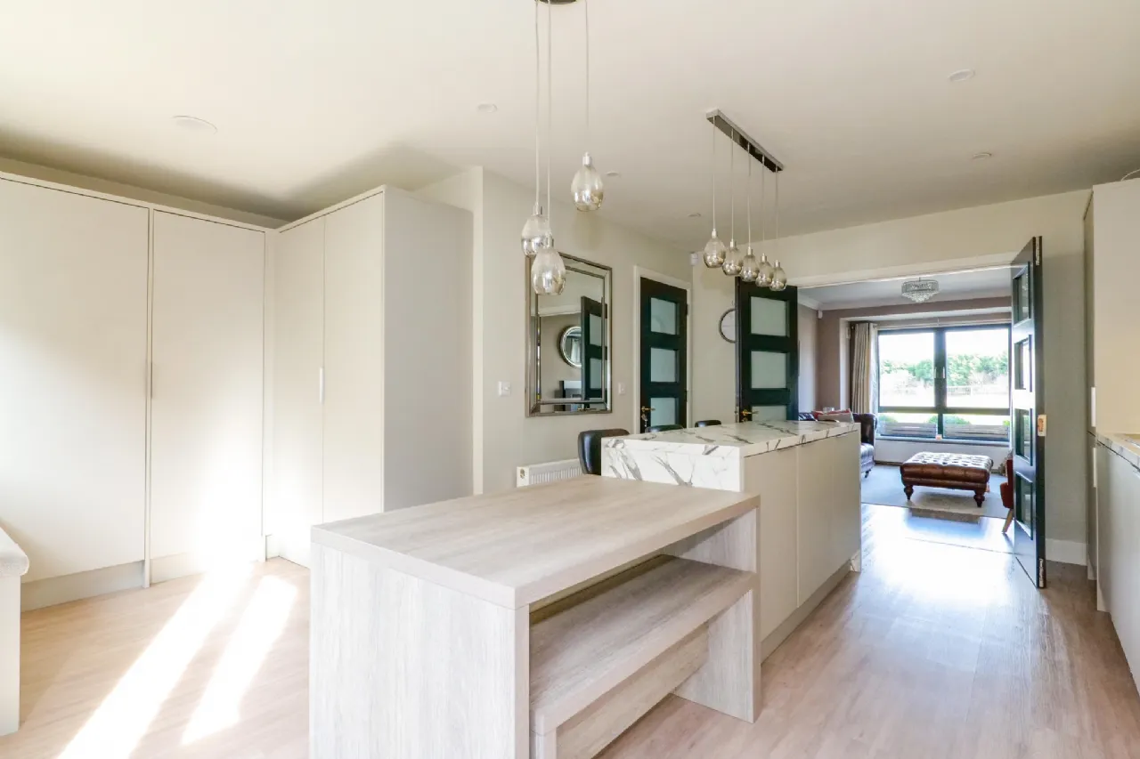 Kitchen /Dining/ Utility area Open plan area featuring recently refurbished kitchen units with island, bench seating area for dining and storage area incorporating washing machine and dryer. Laminate flooring throughout with wall and floor kitchen units with integrated Whirlpool dishwasher, fridge/freezer, hob, oven and microwave. Pendant lighting highlights the island feature and dining area. Window seat under rear aspect window and French doors lead to the west facing rear garden.