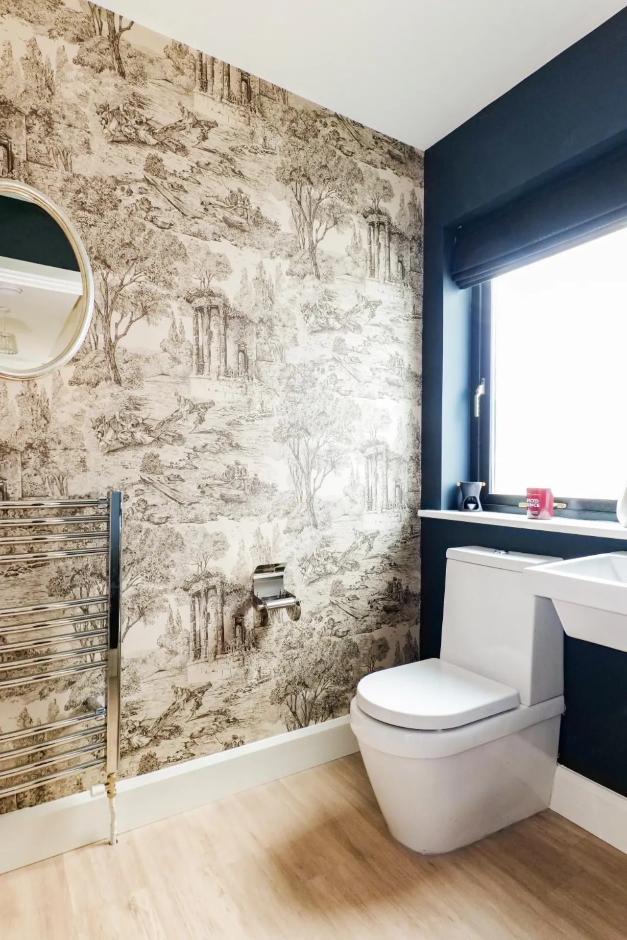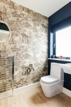 Guest wc: Laminate limed oak timber flooring, wc, wash hand basin, heated towel rail, feature wallpapered walls, side aspect window.