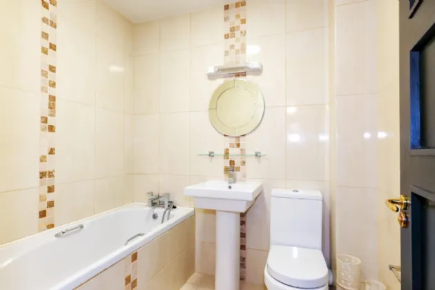Bathroom: Fully tiled walls and floor, wc, wash hand basin, bath with mixer tap, heated towel rail, wall mirror and light.