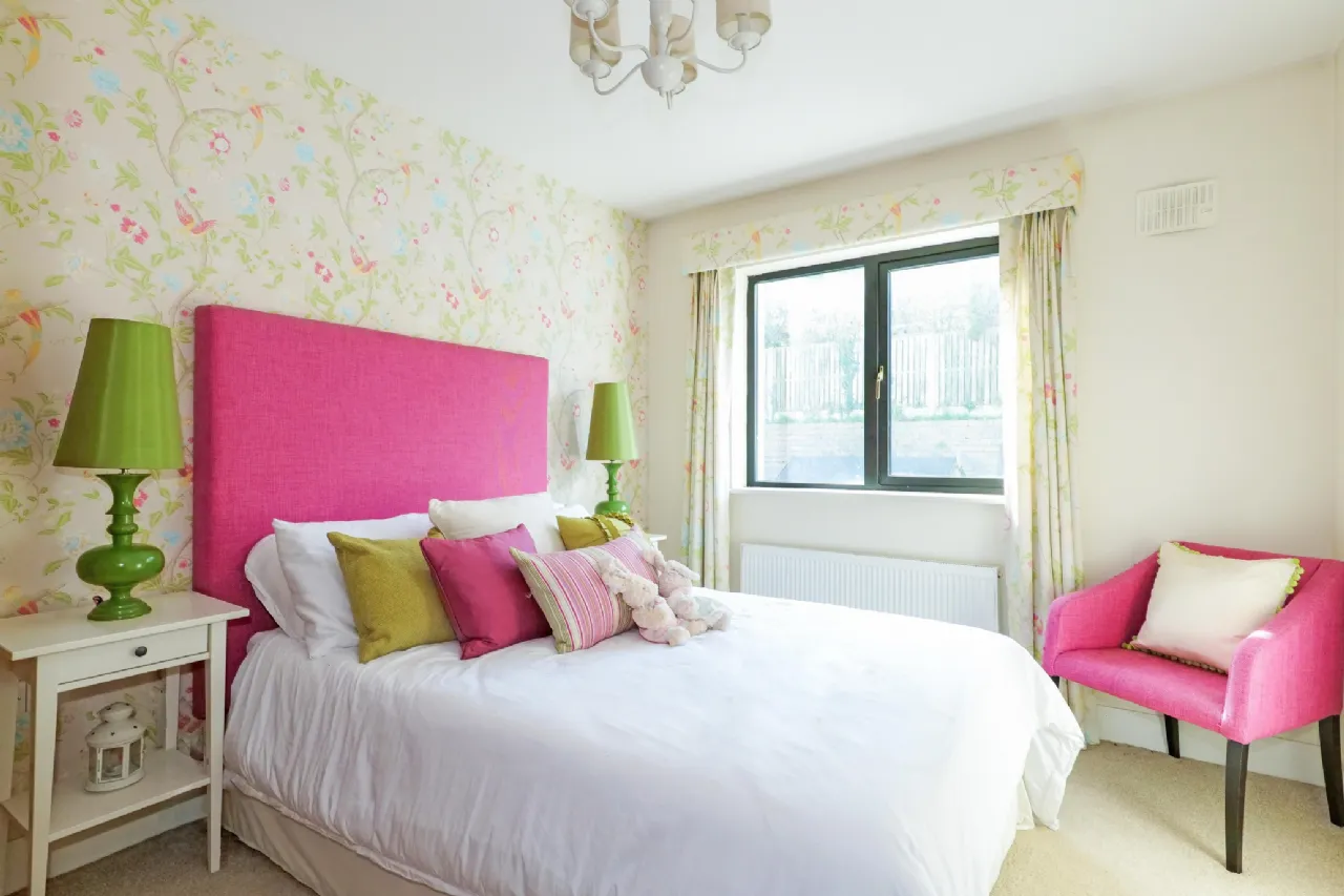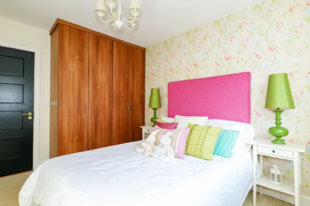 Bedroom 2: Double room, carpet flooring, built in wardrobes, feature wallpapered wall, rear aspect window.