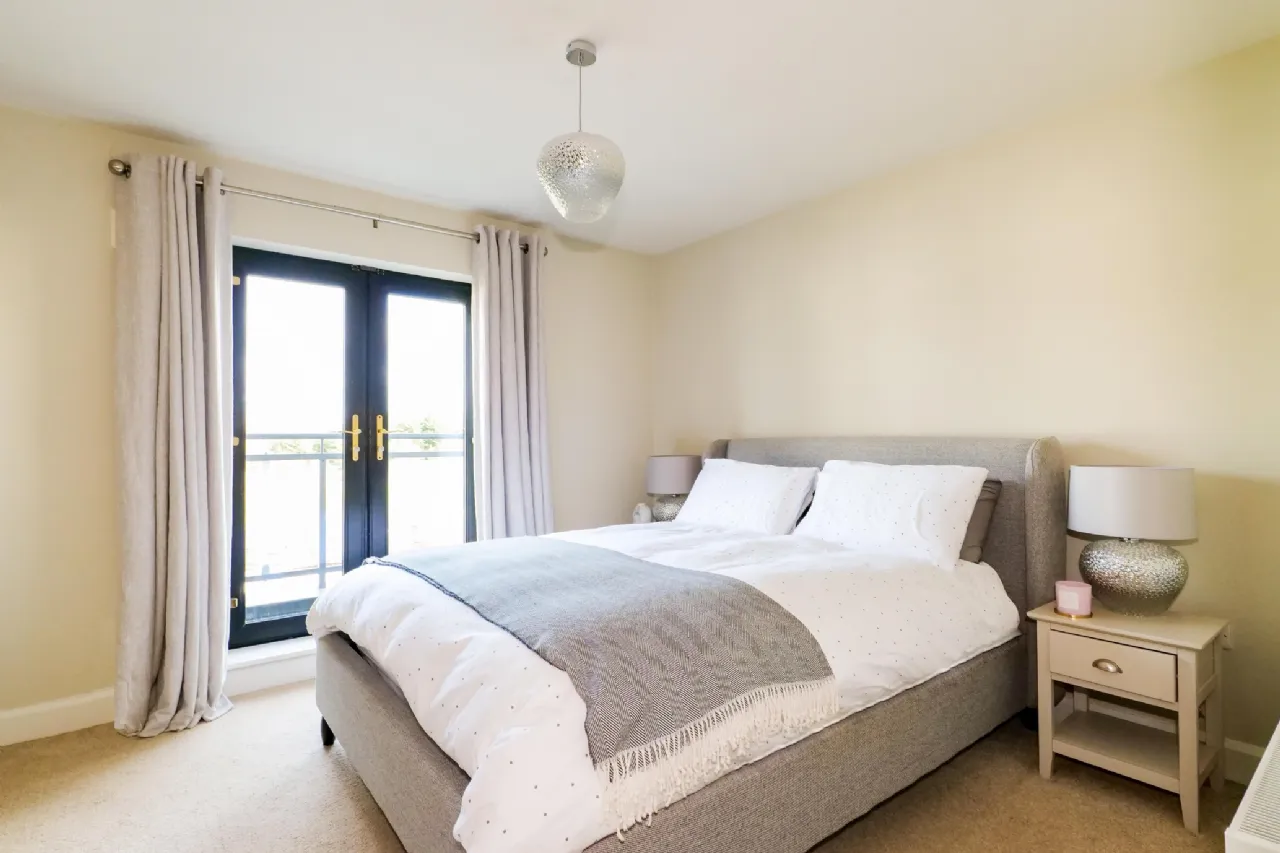 Bedroom 1: Carpet flooring, built in wardrobes, French doors to balcony overlooking green area to front.