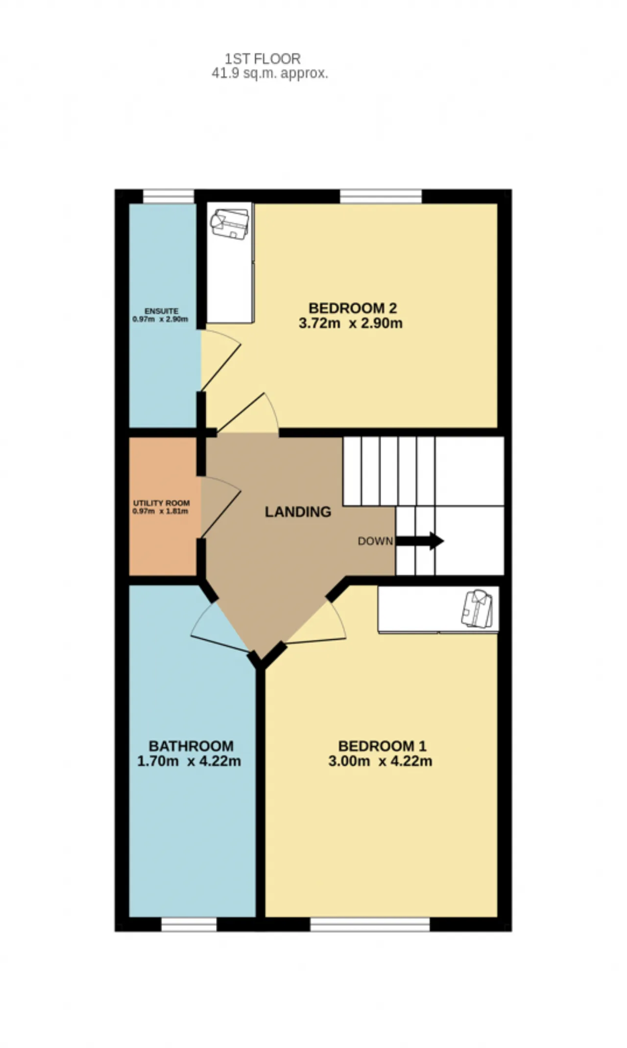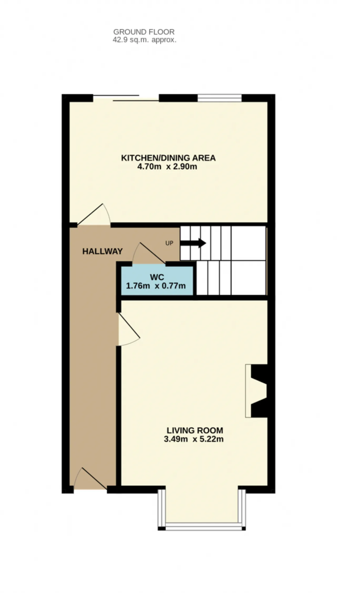 Bathroom: Fully tiled, wc, wash hand basin, mirror, Triton electric shower, front aspect window.