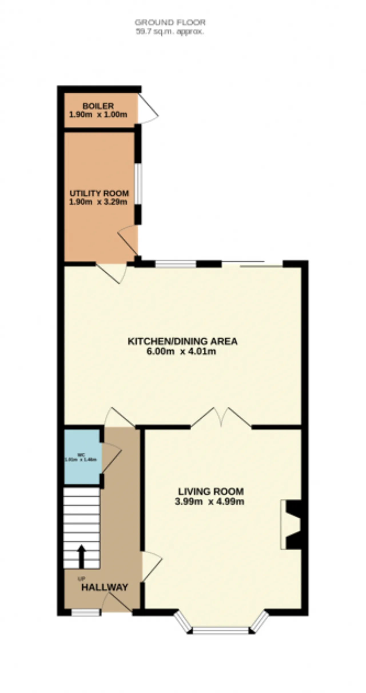 Bedroom 3: Carpet flooring, built in wardrobe, front aspect window. Currently used as home office.