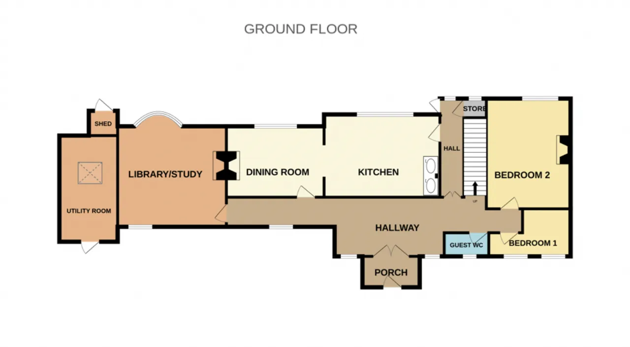 On entering the porch, you are greeted by solid oak stained-glass doors leading to a welcoming hallway adorned with cherry wood cabinetry, intricate wall panelling, and William Morris-style wallpaper. To the left, the Library, a treasured retreat that housed a rare collection of antique books for generations, invites cosy winter evenings by the open fire. The dining room flows into the kitchen, where an oil-fired Aga radiates warmth, complementing three working fireplaces. The ground floor also features a spacious double bedroom, a single bedroom, and a guest WC.