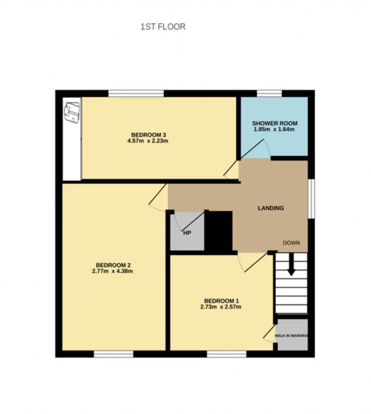 Bedroom 1: Carpet flooring, walk in wardrobe, radiator cover, front aspect window.