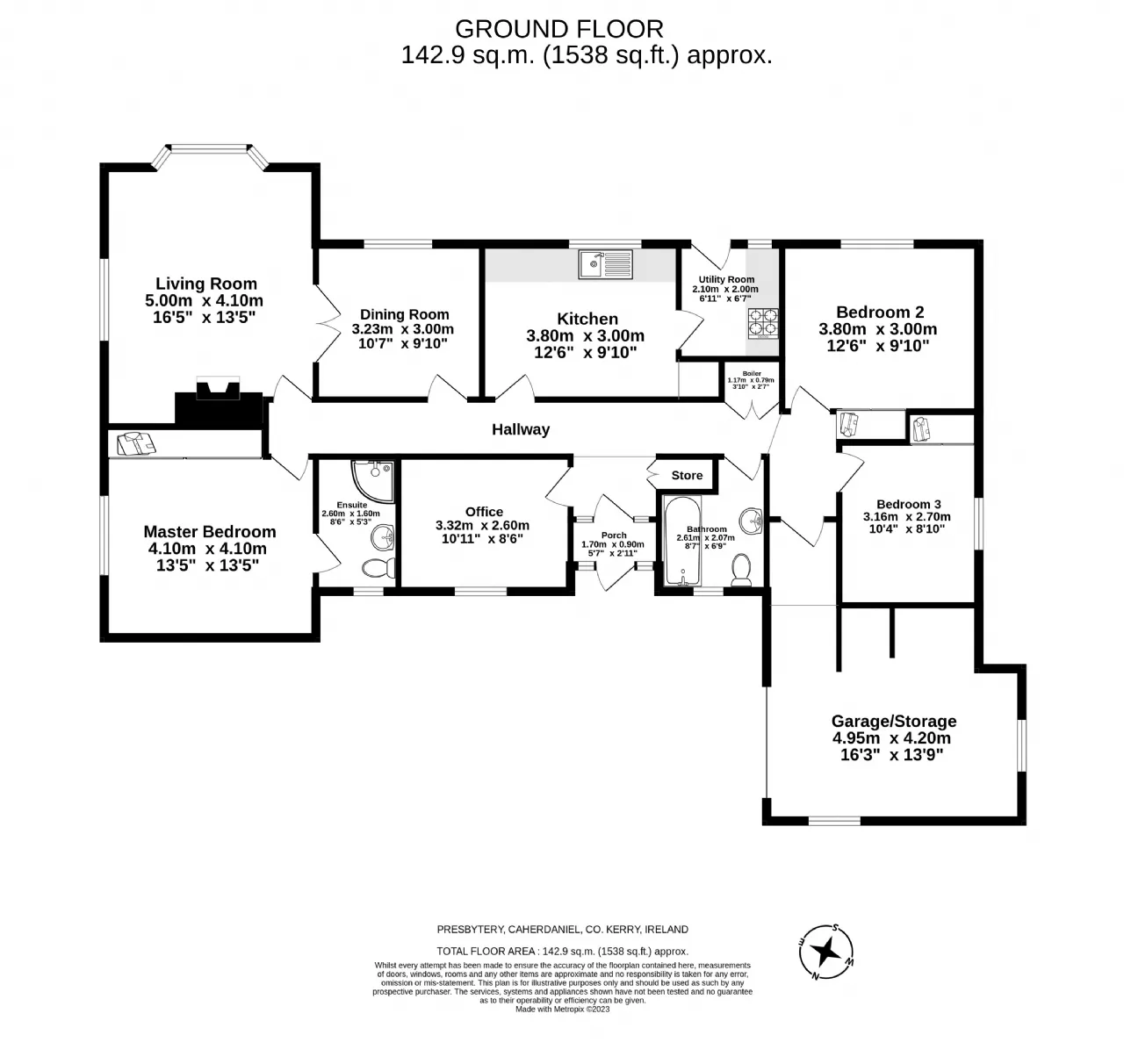 Practicality meets possibility with an internal-access garage/storeroom, as well as the added bonus of a detached garage and a polytunnel—perfect for gardening enthusiasts.