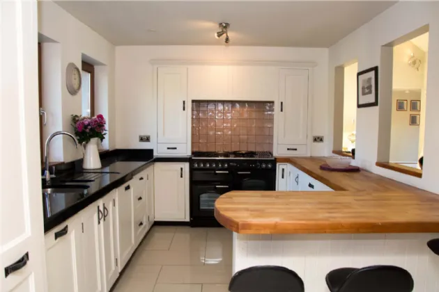 Kitchen 2.80m x 4.50m Fitted kitchen with granite and natural wood surface. Ample storage space; "Range Master". Ring gas oven with electric hot plate and double oven. Tiled Flooring.