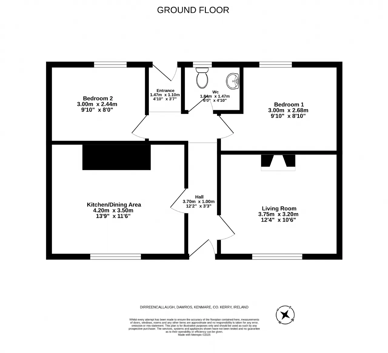 Accommodation consists of : GF: Living room, kitchen / dining area, 2 bedrooms, wc.
