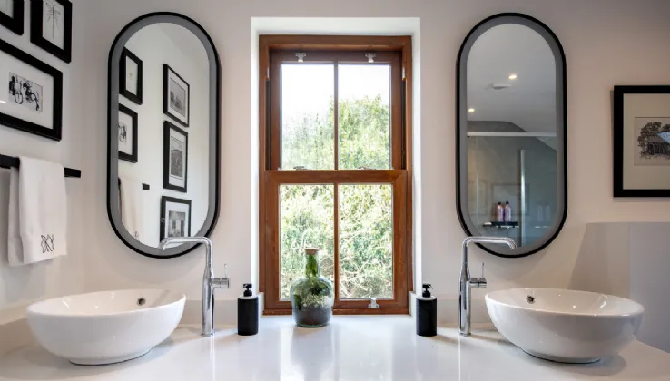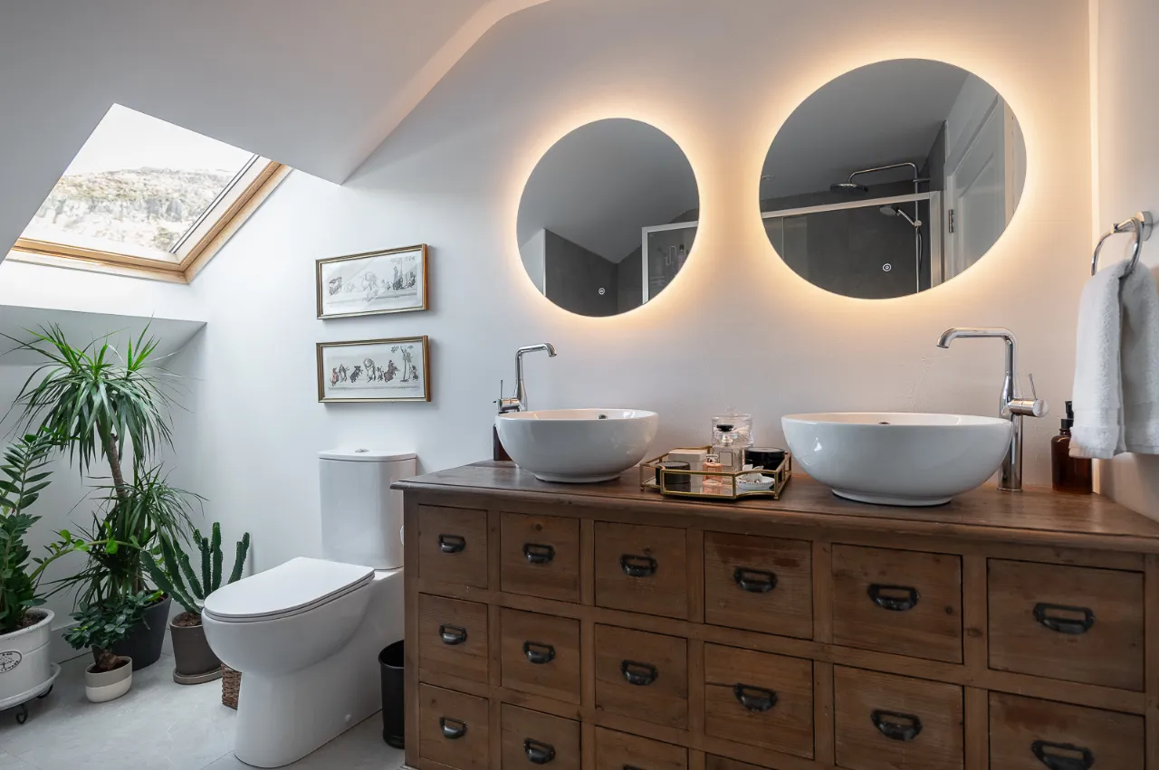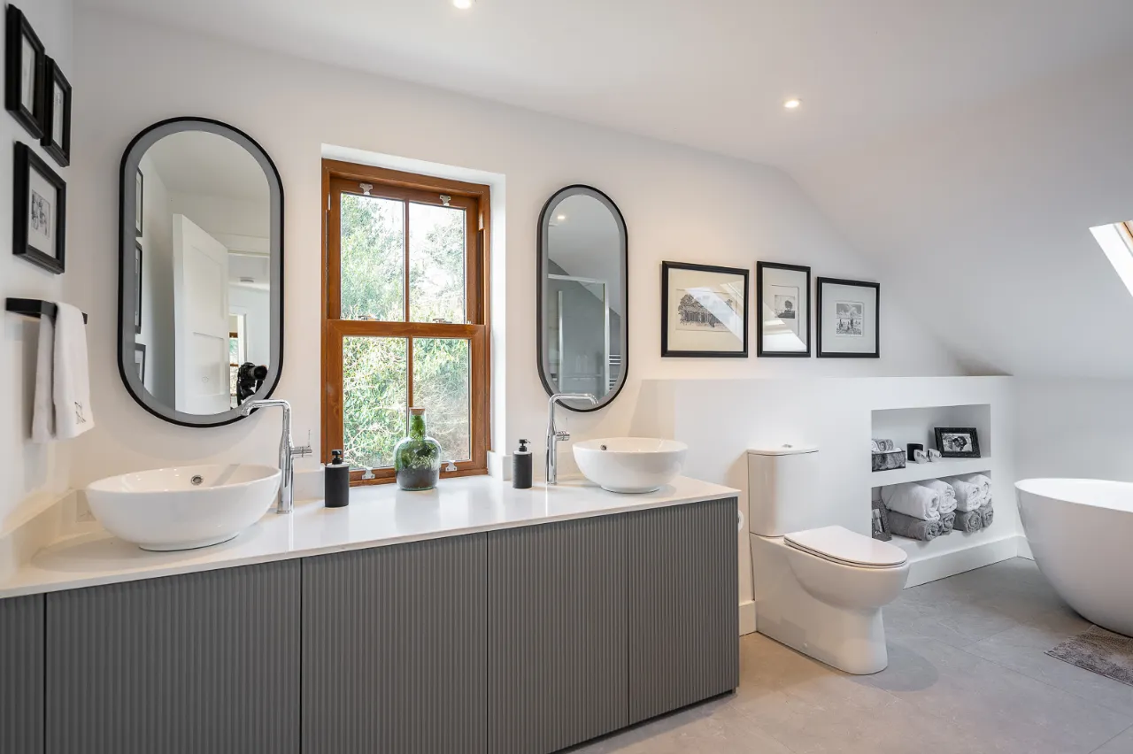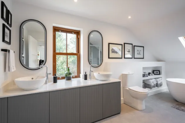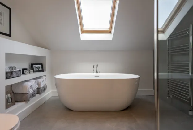Bathroom 3 Boutique hotel style bathroom with heated non-slip tiled flooring. WC. Large oval bath with Velux skylight positioned overhead. Bespoke vanity unit with double sinks and quartz counter-top. Large shower and heated towel rack.