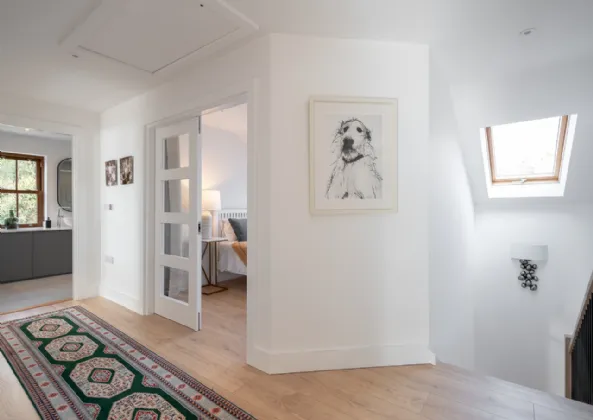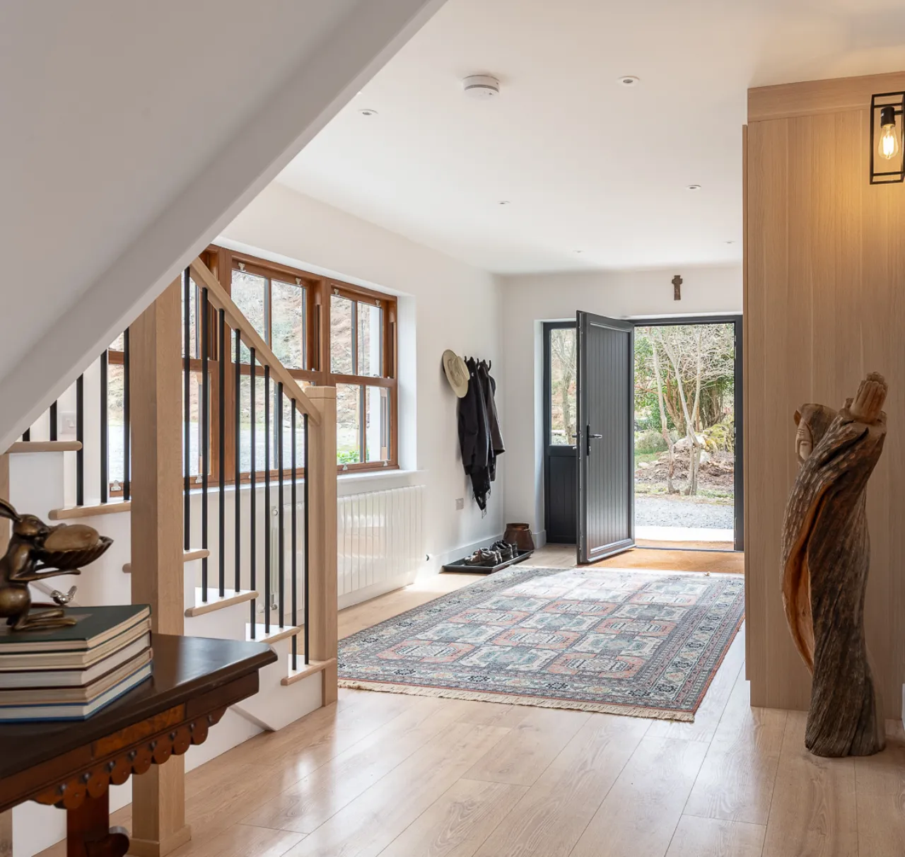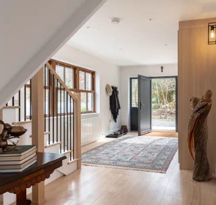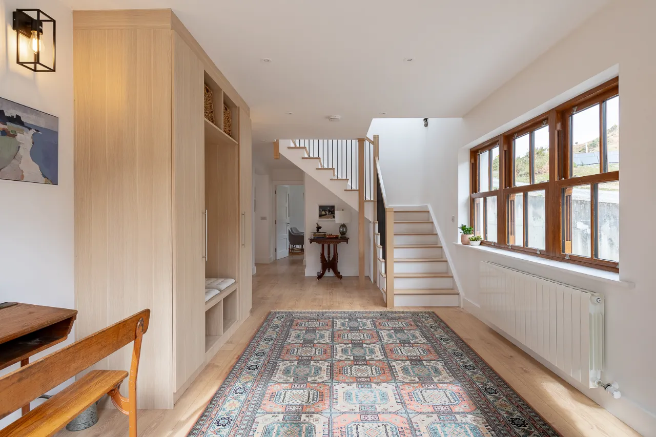 Entrance Hall Large welcoming entrance hall with bespoke built-in closet and seating bench. The entrance leads to the living room and stairwell. Holbein designed and made the white oak stairs that lead to the first floor.