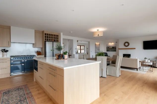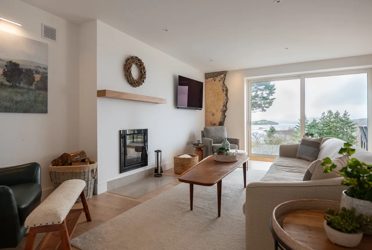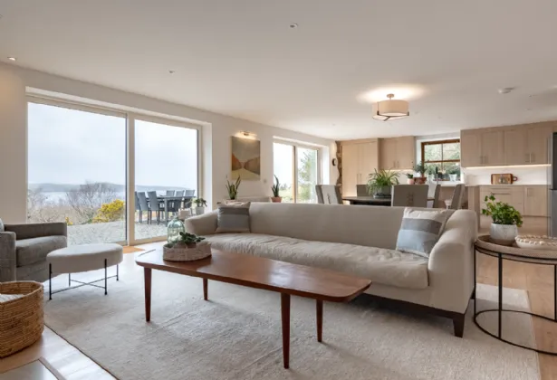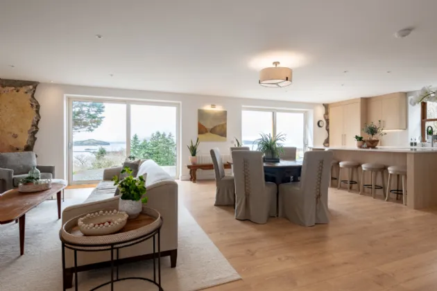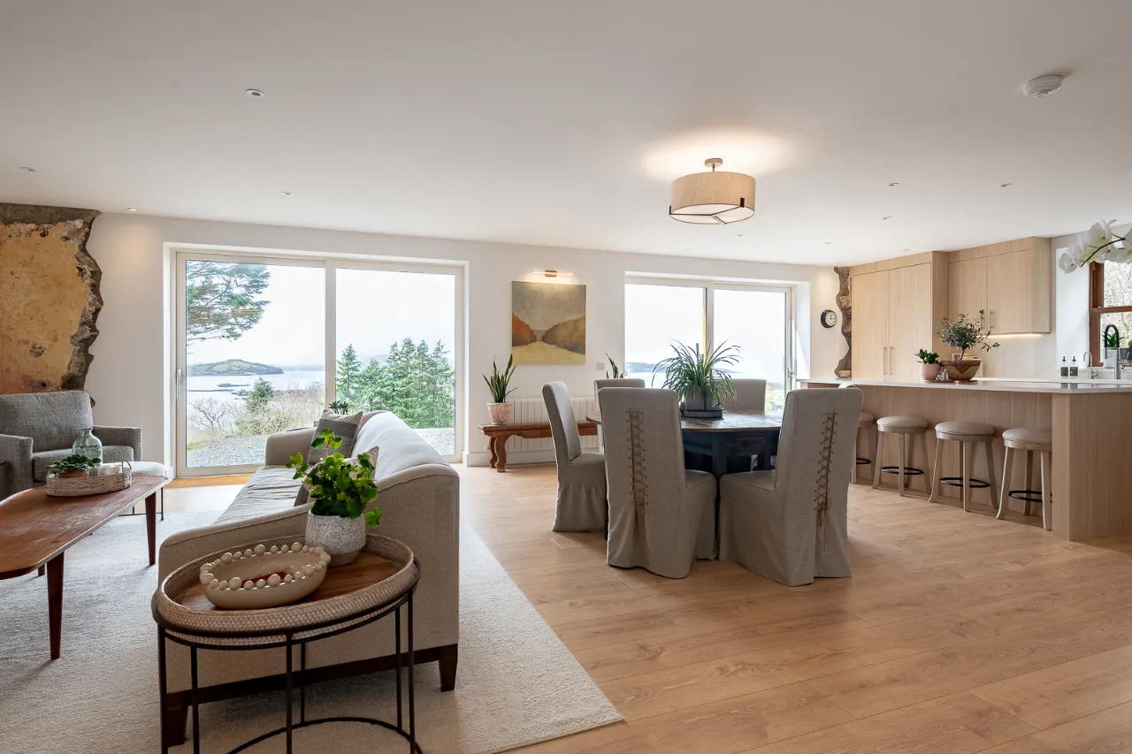 Living Room/Dining Room The first thing you immediately see when entering the living/dining room are the views. With two 2.8m sliding glass doors out to the patio, you can enjoy the vast sea and countryside views at all times. There is a solid fuel stove with a handmade Sweet Chestnut mantel made from the old tree that was located beside the old post office in Kenmare. The living room, dining room and kitchen are all located in the original area of the schoolhouse. There are small sections of the original school walls left on either side of the sliding doors in a nod to the history of the house.
