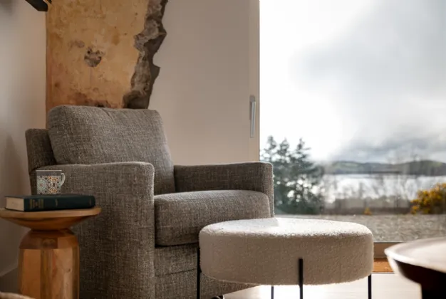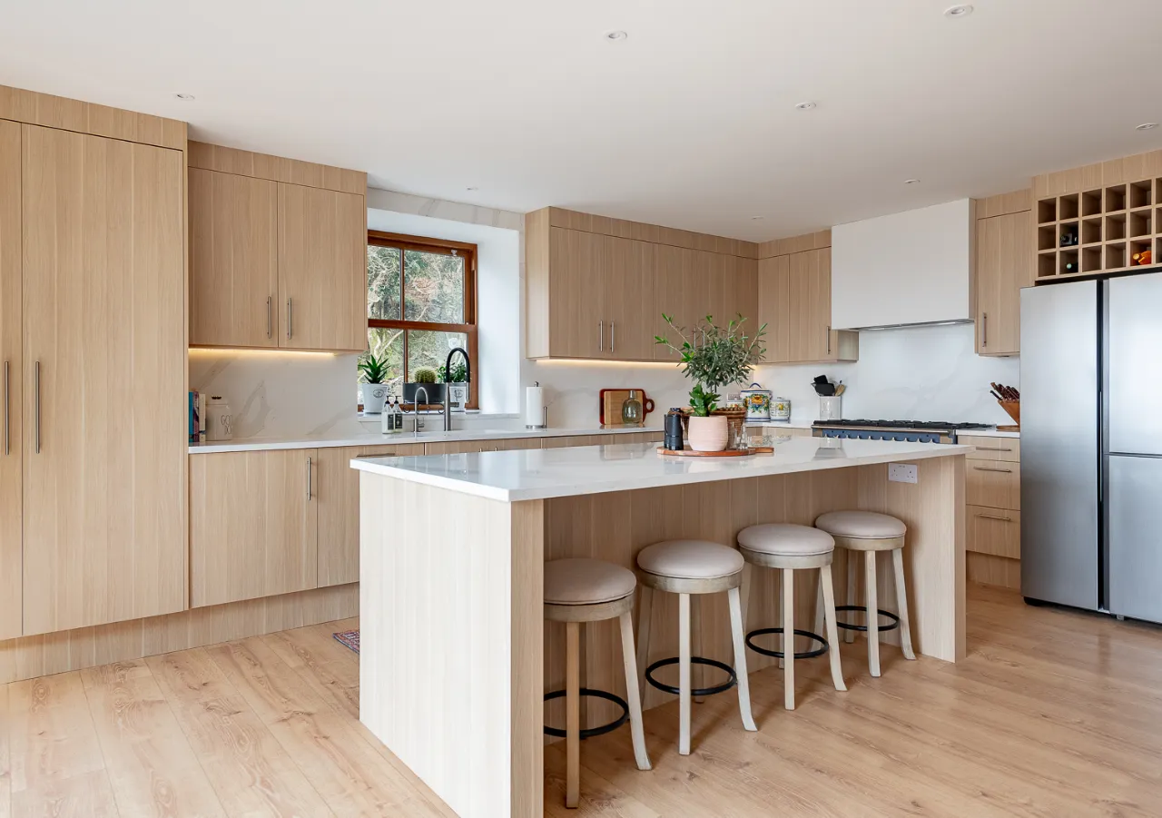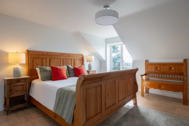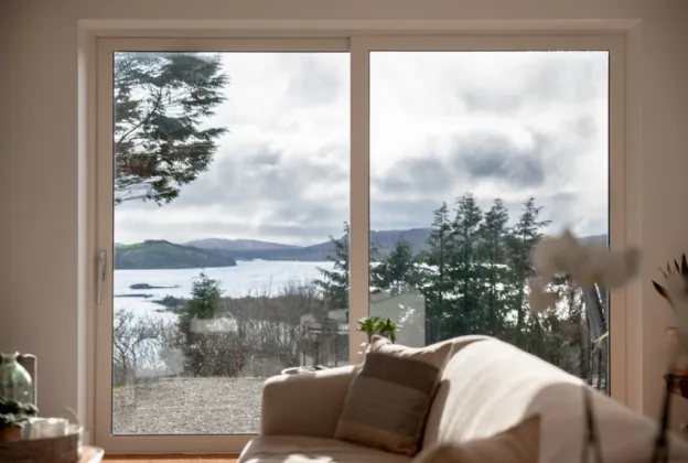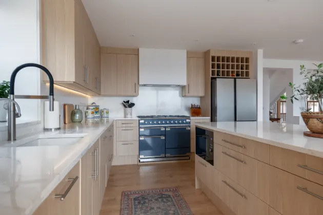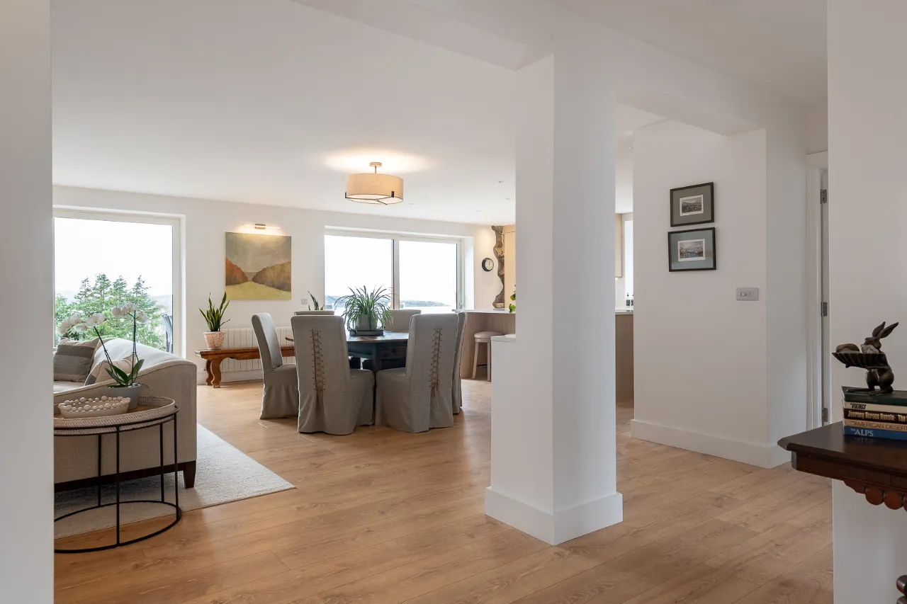Living Room/Dining Room The first thing you immediately see when entering the living/dining room are the views. With two 2.8m sliding glass doors out to the patio, you can enjoy the vast sea and countryside views at all times. There is a solid fuel stove with a handmade Sweet Chestnut mantel made from the old tree that was located beside the old post office in Kenmare. The living room, dining room and kitchen are all located in the original area of the schoolhouse. There are small sections of the original school walls left on either side of the sliding doors in a nod to the history of the house.