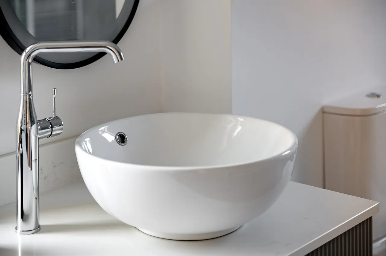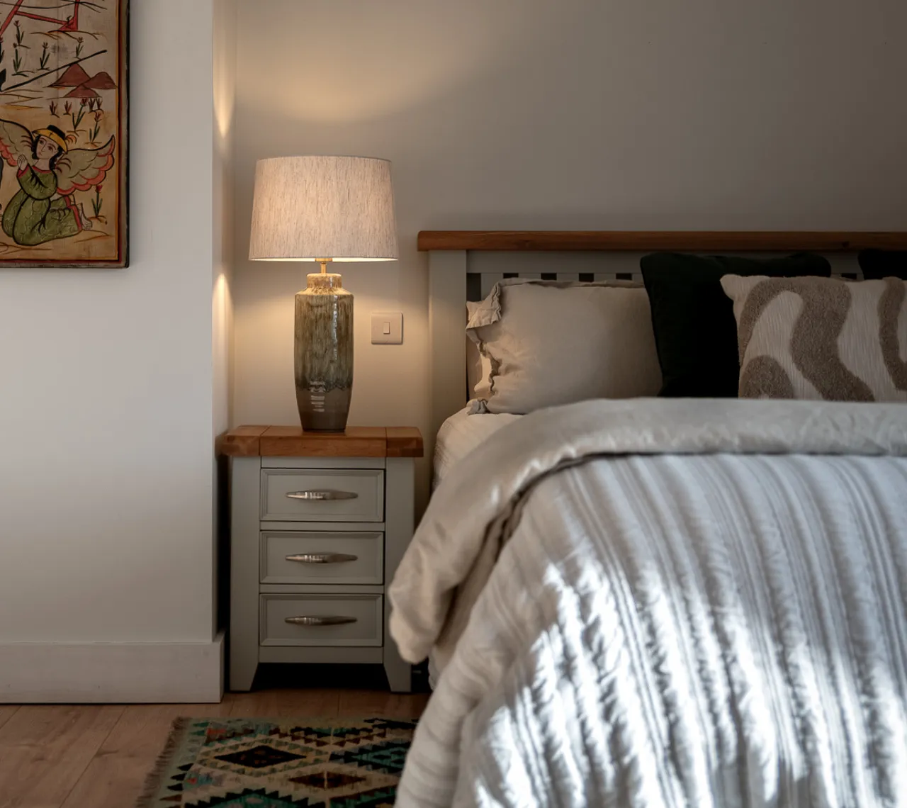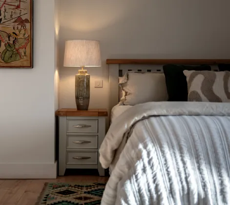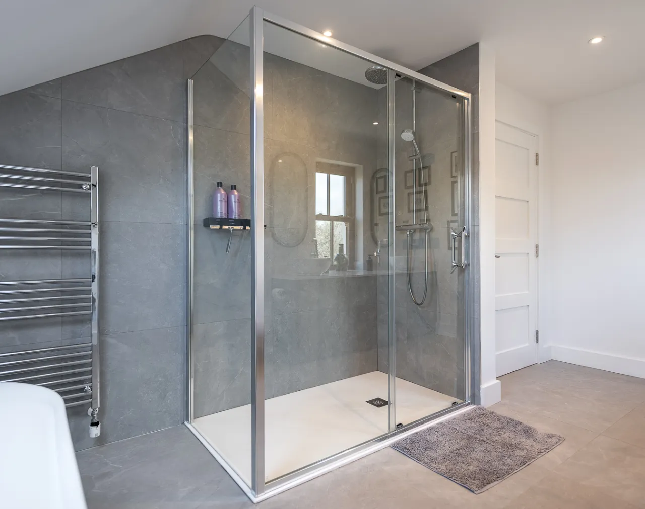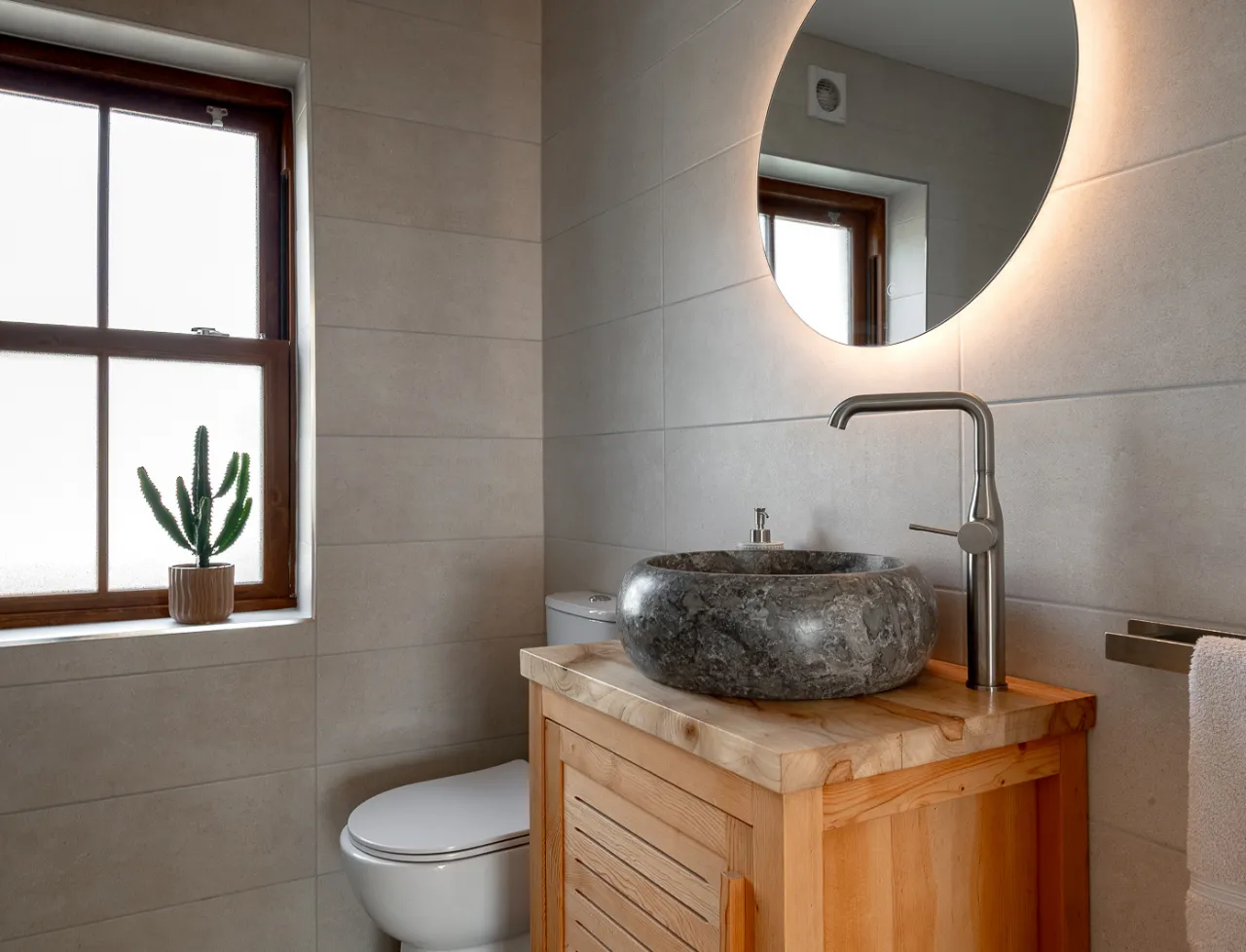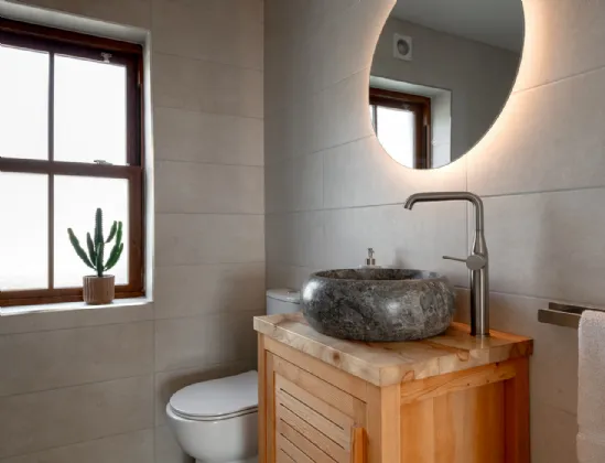 Bathroom Floor to ceiling tiled with non-slip floor tiles. A bespoke cedar and local sycamore vanity with a stone sink. Open shower with glass panels.