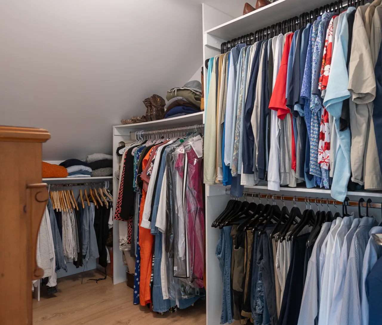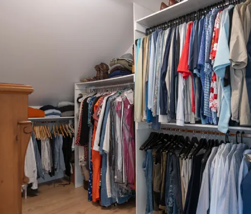 Walk-in Wardrobe Fitted shelving and clothes rails.