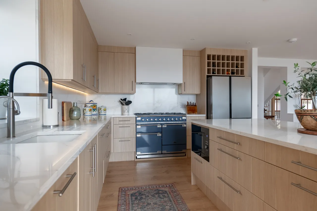 Kitchen Bespoke fitted kitchen. The backsplash and countertops are all matching quartz. The kitchen boasts all top-quality appliances including a 110cm Rangemaster 6 ring cooker with two ovens and a built-in grill, an American sized Samsung fridge/freezer with an ice bites/cube ice maker, filtered cold-water dispenser and a built-in infused water jug. The Siemens dishwasher is integrated into the cabinets. The quartz top island (1.5m x 3m) has a built-in microwave, plenty of storage and can seat 4 people. There is an enclosed wine and cocktail bar and built-in wine rack.