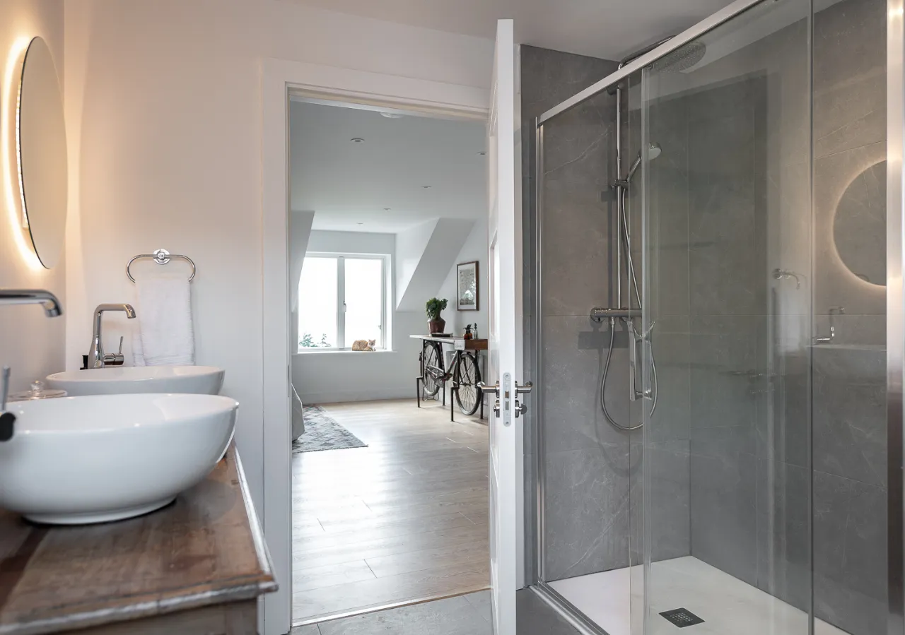 En-Suite Underfloor heated non-slip floor tiles and tiled shower. The double sinks sit on a bespoke vanity unit with backlit mirrors over each sink. There is a large glass paneled shower and heated towel rack.