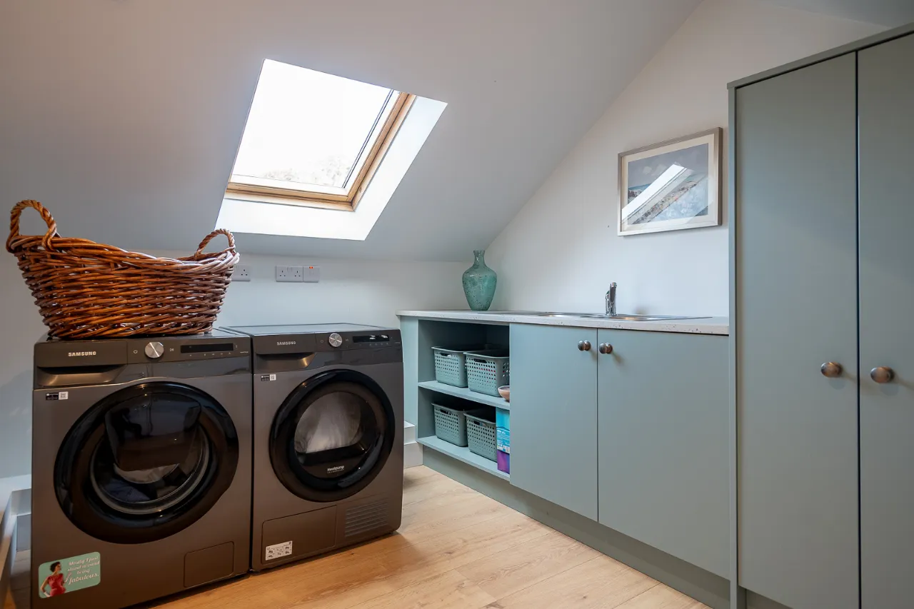 Laundry/Utility Room Fitted storage and counter space with stainless steel sink and Samsung washer and dryer.