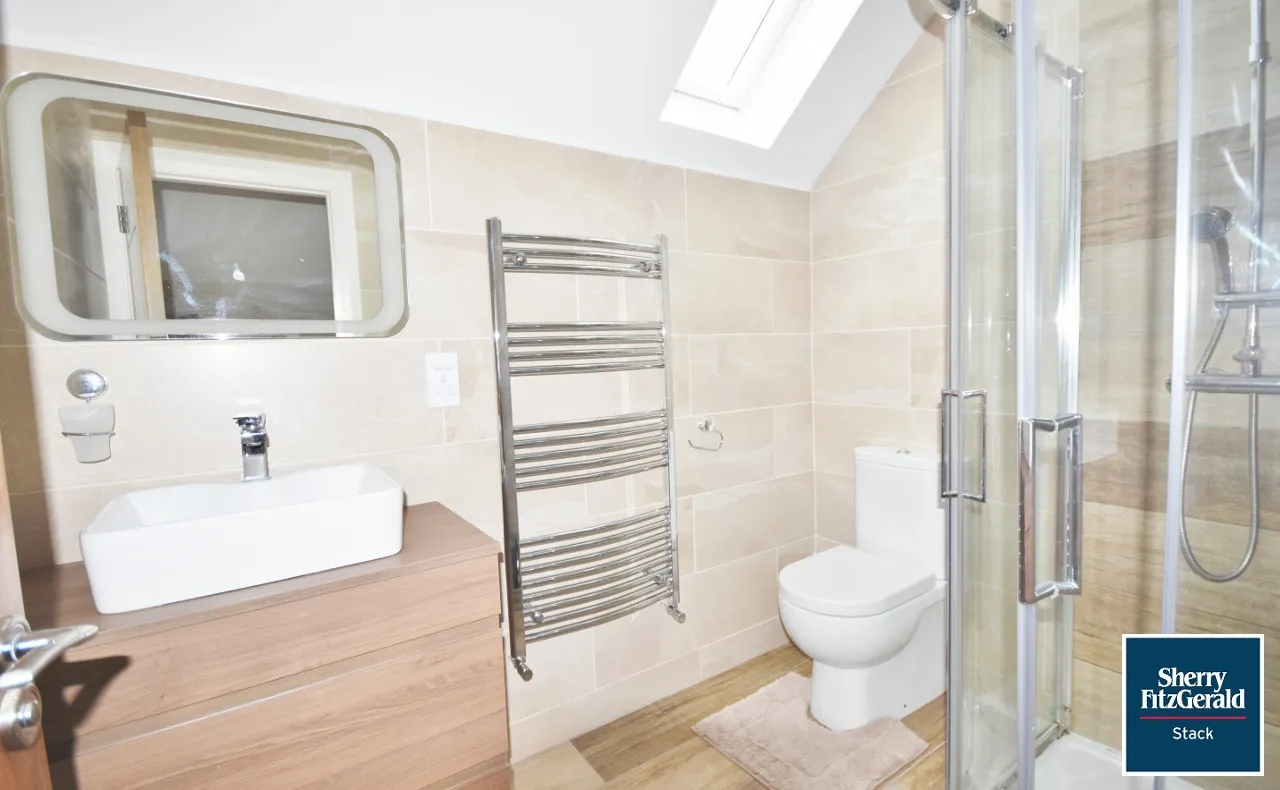 Family Shower Room 2.34m x 1.65m with vanity unity with whb and led mirror, pumped shower, heated towel rail, wall & wood effect floor tiles, w/c & velux window.
