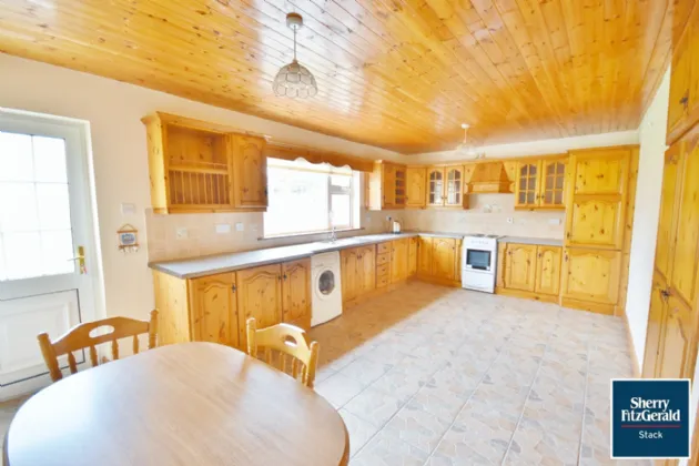Kitchen/ Dining Room 6.15m x 6.14m with wooden pine fitted units with integrated oven hood, plumbed for washer, ceramic floor tiles and backsplash, window and door with frosted window leading to the rear.