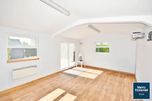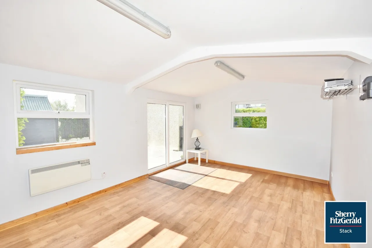Detached Home Office/ Hobby Room/ Gym 5.70m x 3.82m Wood laminate flooring, sliding door and two windows.