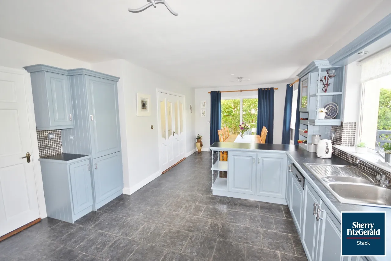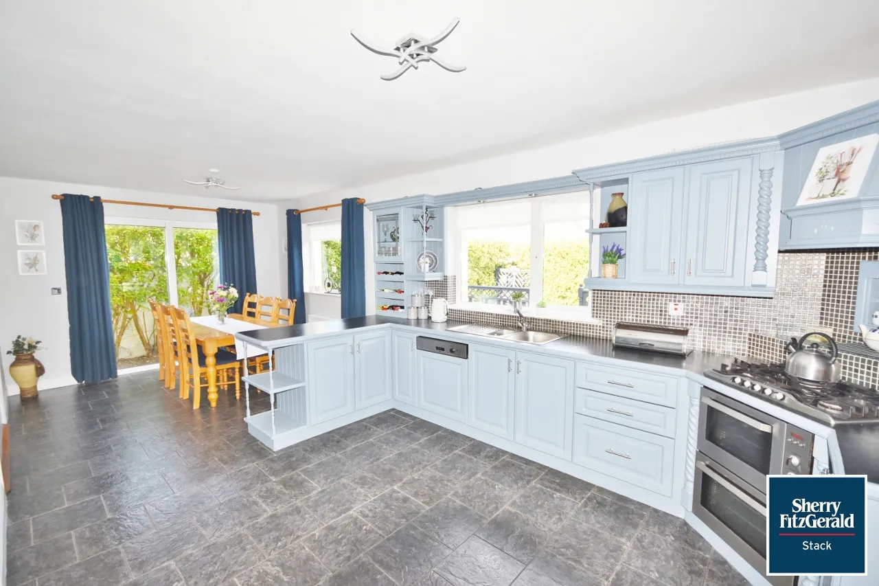 Kitchen/ Dining Room 7.24m x 3.23m Featuring hand painted fitted units, ceramic tile backsplash, integrated extractor and oven, cirque stone effect floor tiles, sliding door to the side and two windows.