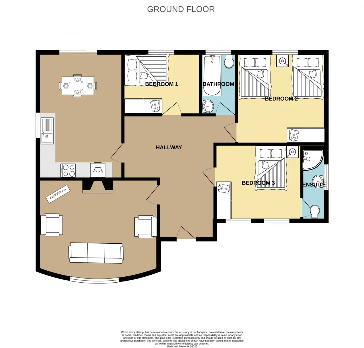 Inside, the property features a spacious kitchen and dining area that opens out to the rear garden — perfect for family meals and entertaining. The cosy living room boasts an open fireplace, adding warmth and charm to the space. There are three well-proportioned bedrooms, one of which includes an ensuite bathroom. A main family bathroom offers both a bath and shower. The property benefits from double-glazed windows throughout and is fitted with electric heating.