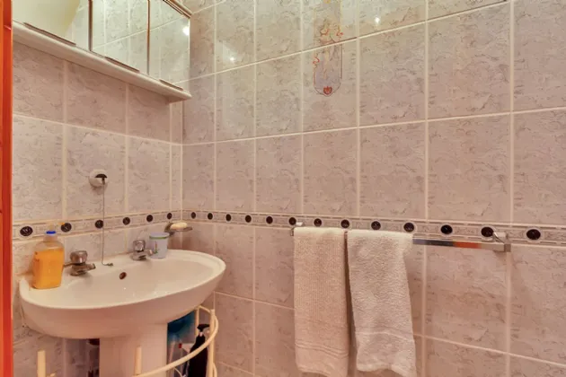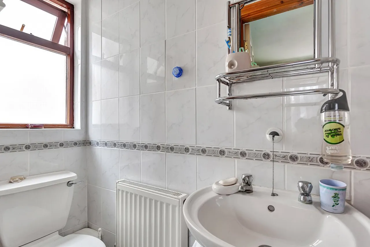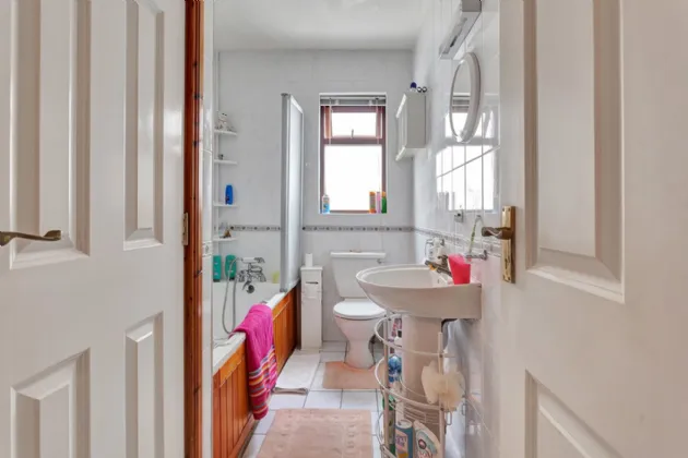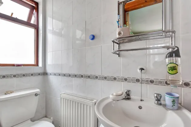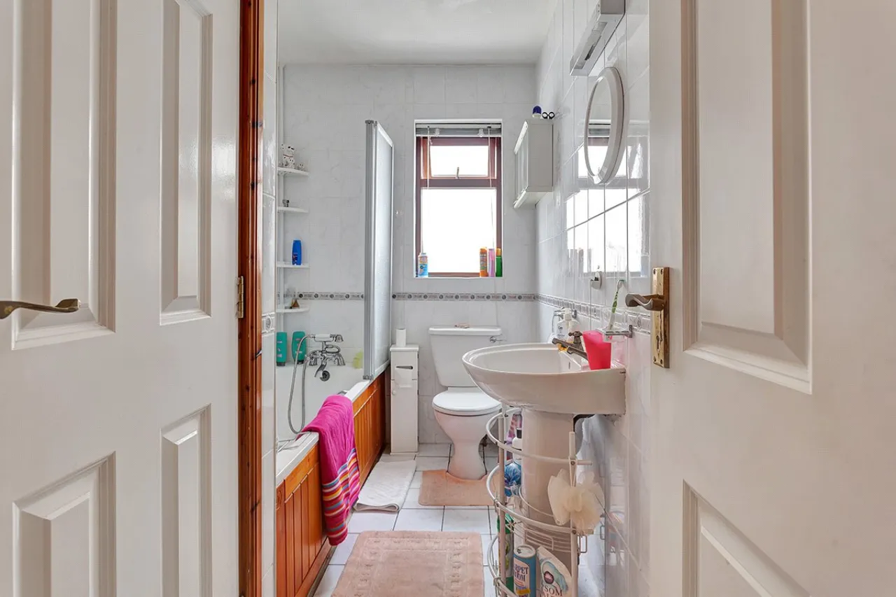 Main Bathroom 2.97 x 1.70 W.C. W.H.B. Bath. Blind. Light fitting. Tiled floor & walls.