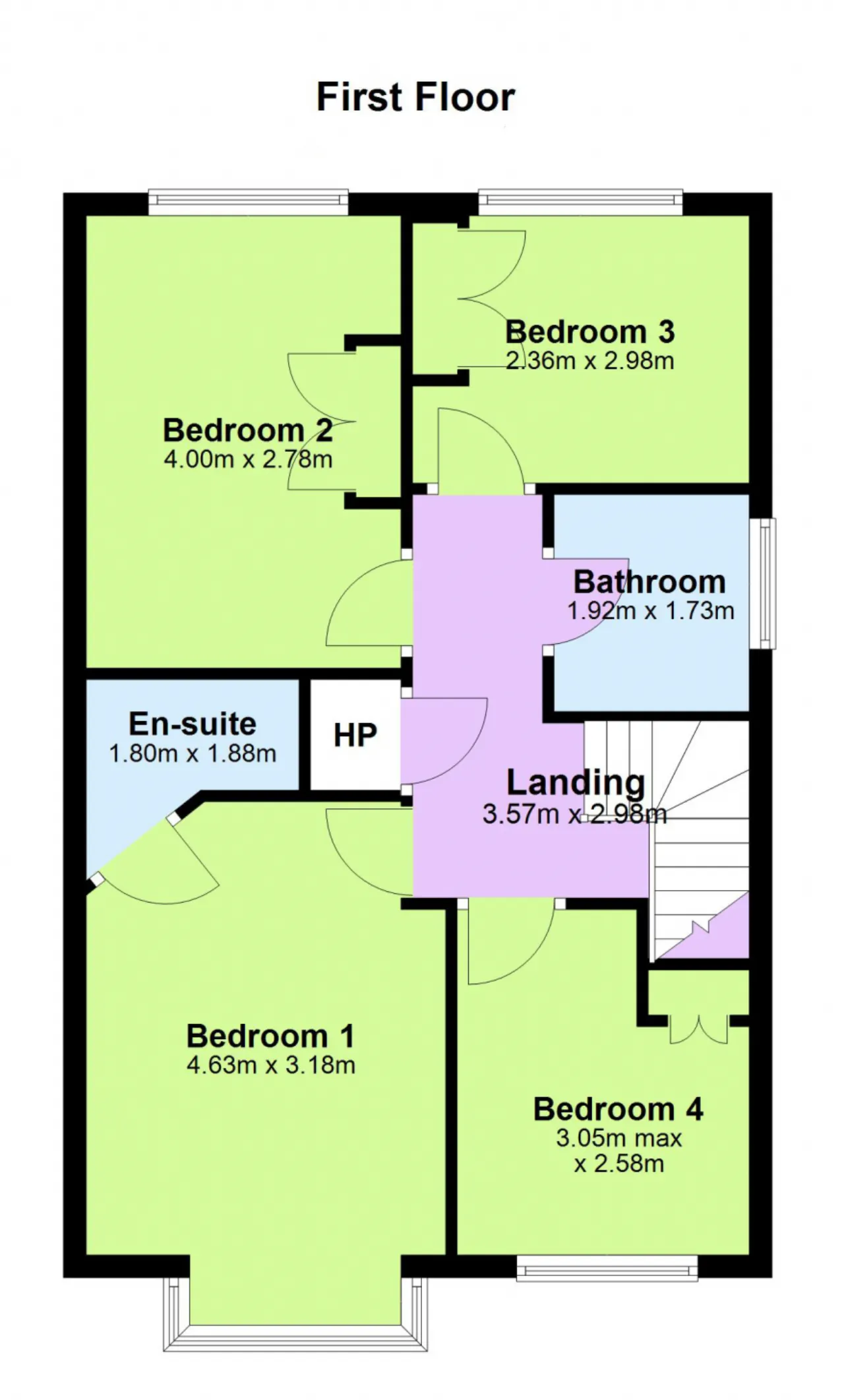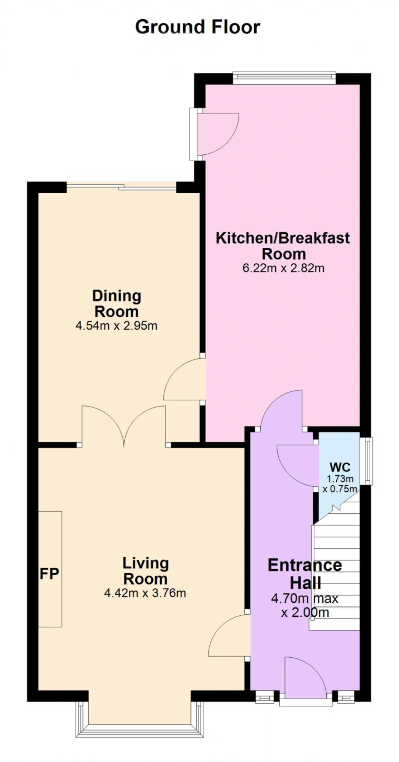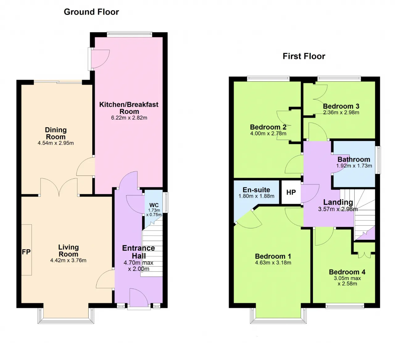 Bedroom 1 4.63m x 3.18m Main double room with carpet flooring and fitted wardrobes. Bay window to the front of the property.