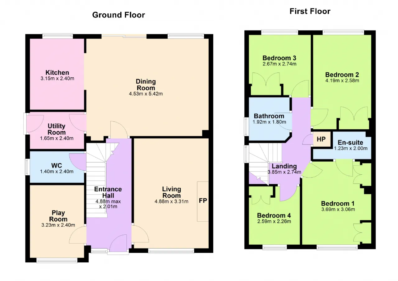 The ground floor offers a well-balanced and versatile layout. A light-filled open-plan kitchen, dining, and living area provides the perfect setting for modern family life, while a cosy front sitting room with a wood-burning stove offers an inviting retreat. An additional reception room on the ground floor could be used as a playroom, home office or fifth bedroom. A utility room and guest W.C. complete the ground floor accommodation.