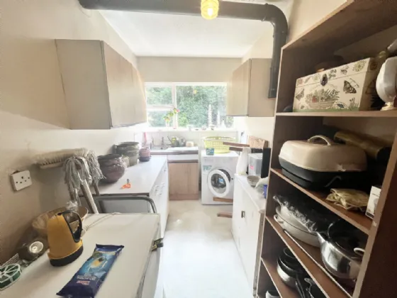 Utility Room 3.6m x 1.8m With fitted storage units, sink unit, vinyl flooring, tiled splashback.