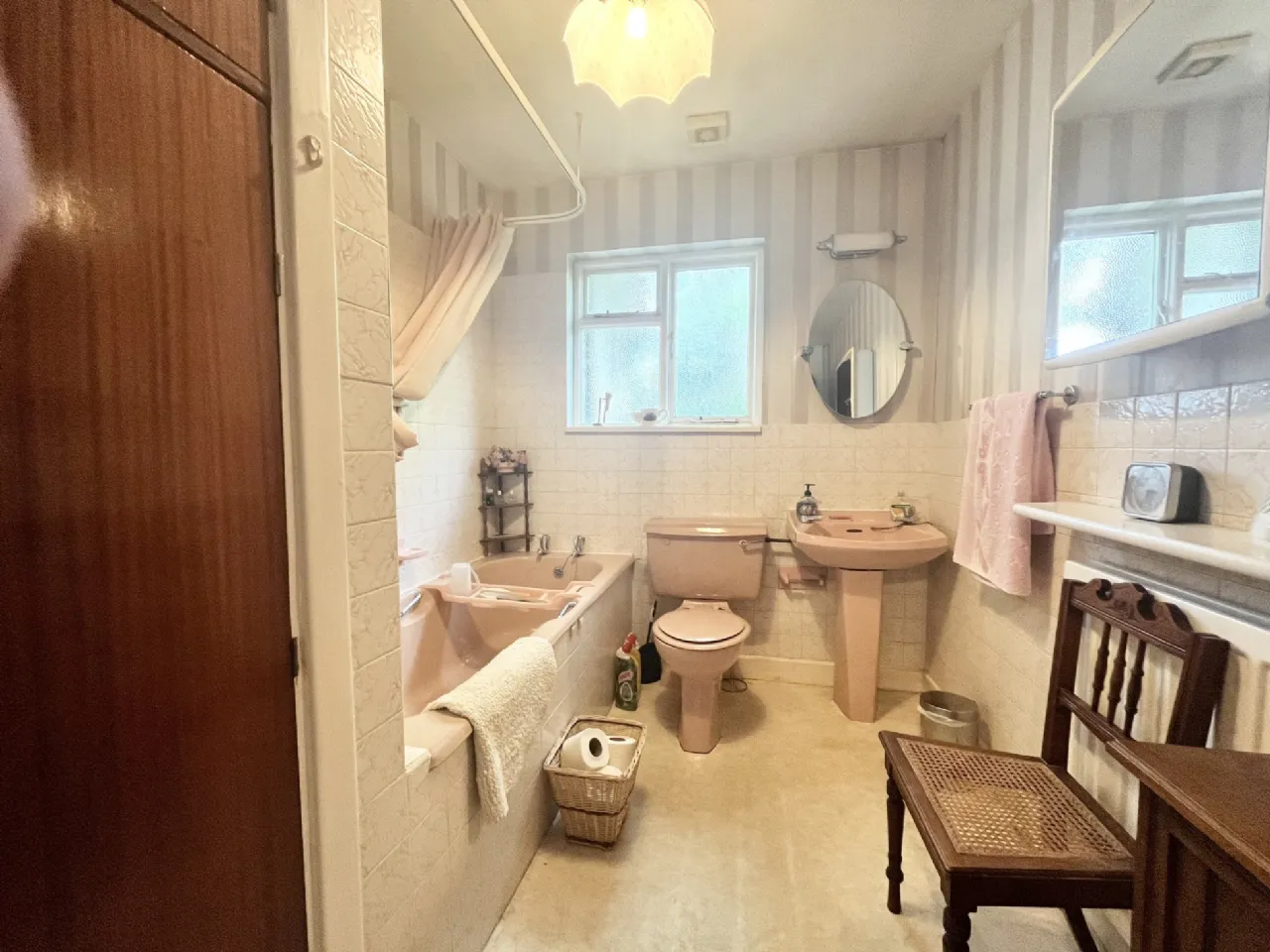 Bathroom 3.0m x 2.0m With bath, shower INTO the bath, wc, whb, vinyl flooring, tiled splashback, shaving light, mirror, bathroom cabinet, airing cupboard.