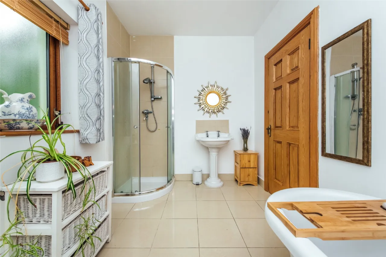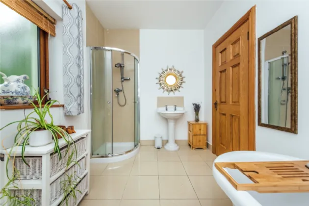Bathroom 2.3m x 3.5m With antique style bath, shower, wc, whb, tiled floor, tiled splashback, shower screen,