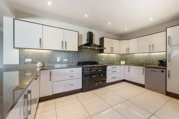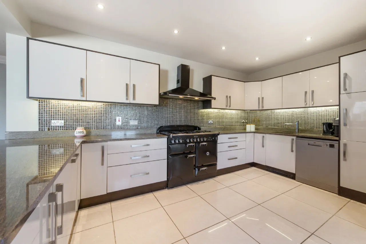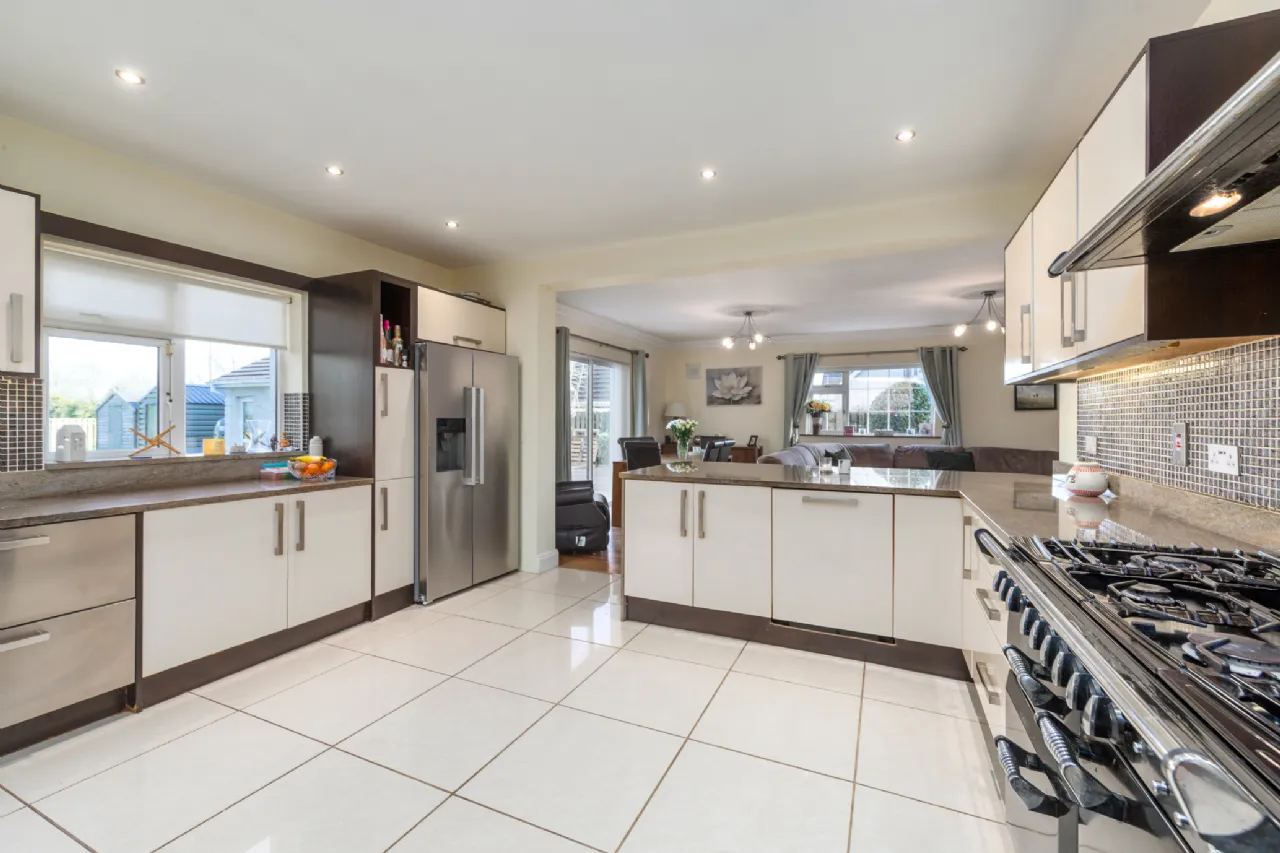 Kitchen 4.46m x 5.09m With an extensive contemporary fitted kitchen with ample fitted units and breakfast counter. Granite work surfaces. Tiled flooring. appliances included in sale.