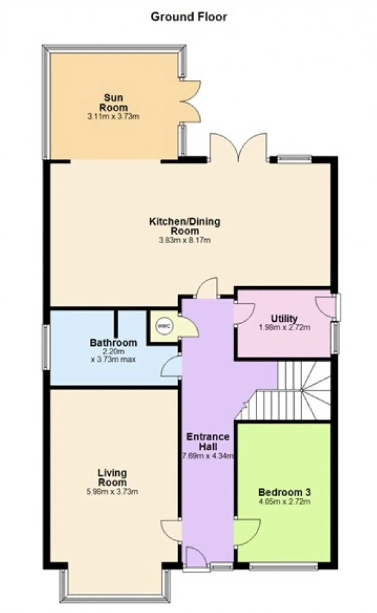 Sun room 3.11m x 3.73m A brightly lit, spacious sunroom with two large doors to the side which open out on to the rear garden. Tiled flooring throughout.