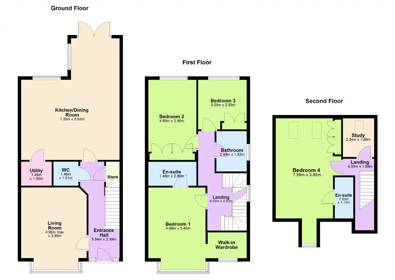 On the first floor, there are three superb bedrooms, including a magnificent master suite with walk-in wardrobe and a beautifully appointed en-suite, together with a luxurious family bathroom. The second floor offers a further exceptionally spacious double bedroom with its own en-suite, along with a large office/study – ideal for remote working or quiet retreat.
