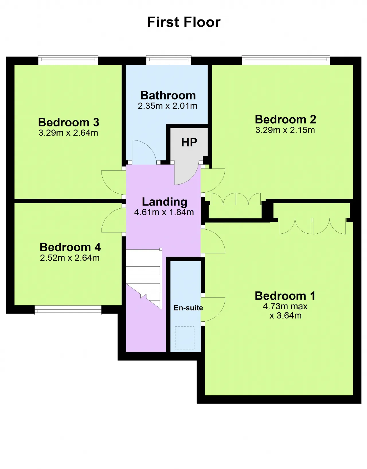 Bedroom 1 (En-suite) 4.73m x 3.64m Master to the front with built in wardrobes, carpet flooring. En-suite complete with shower & WHB and Velux window.