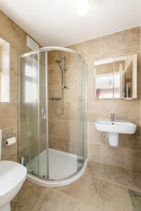 Bedroom 1 4.58m x 3.27m With extensive fitted wardrobes. Timber flooring. Ensuite with shower enclosure, WC & WHB. Fully tiled.