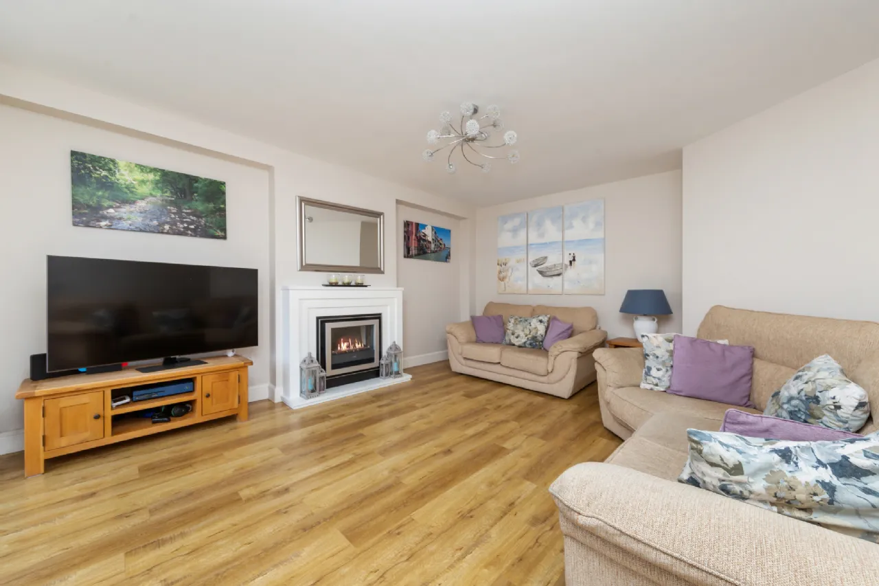 Living Room 5.34m x 4.11m With large bay window, attractive feature fireplace & oak flooring.