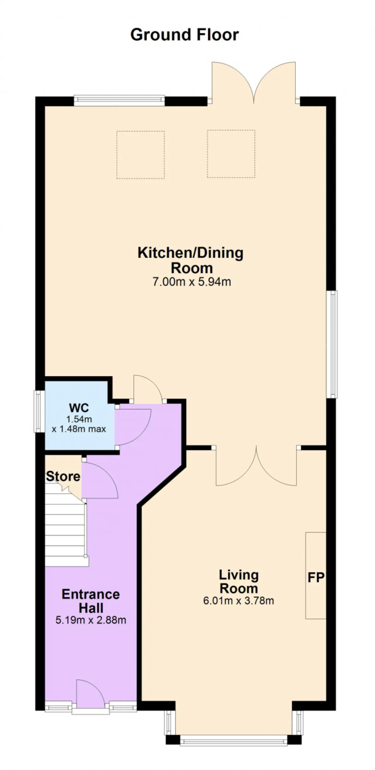 Kitchen / Dining Room 7.00m x 4.94m Stylish open-plan living, dining, kitchen area with quality herringbone timber flooring. Quality contemporary fitted kitchen units with solid timber work surface and breakfast bar. Two Velux windows illuminate the space. Bespoke wall paneling & architrave. French doors leading to rear garden.