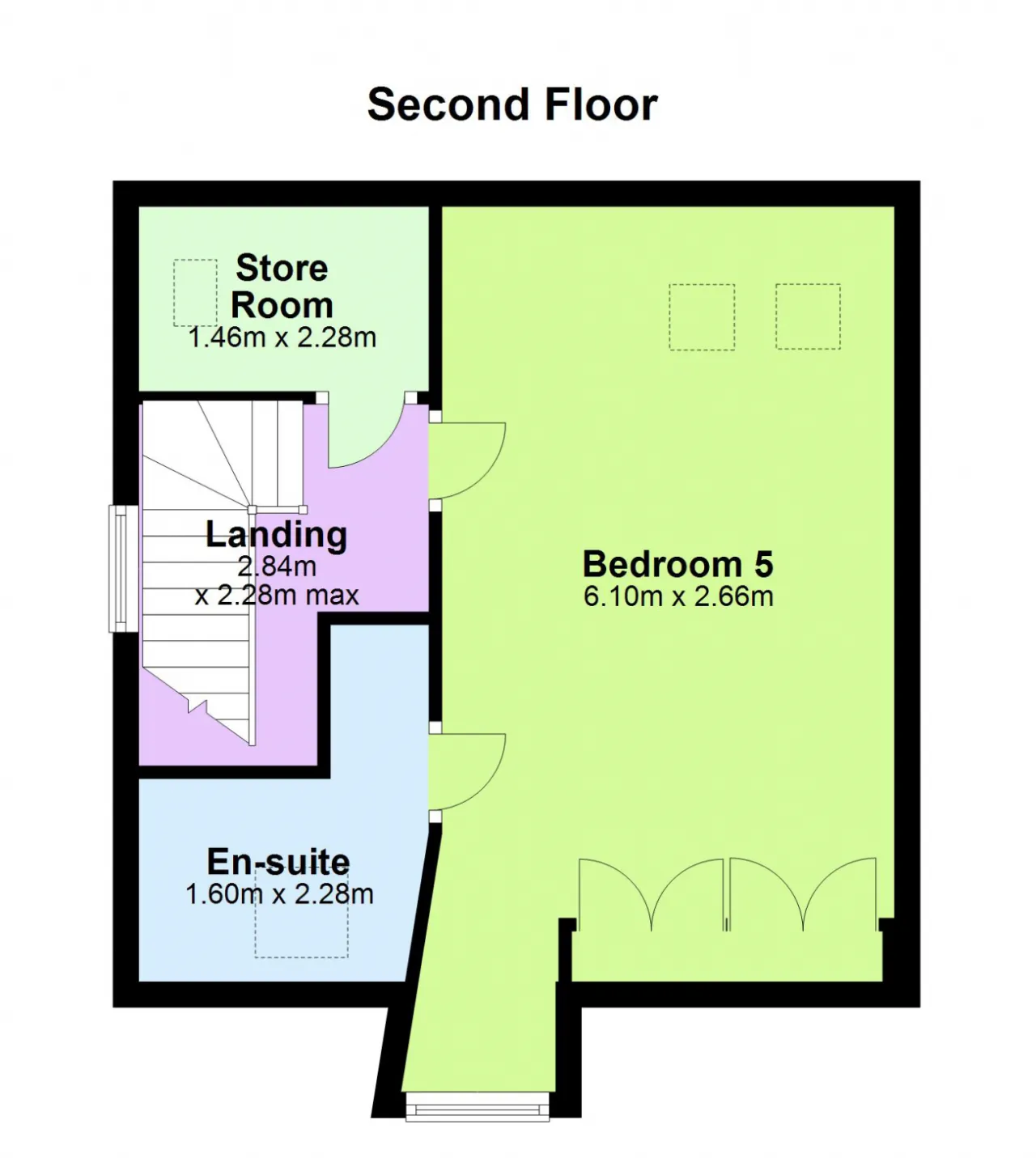 Bedroom 5 6.10m x 2.66m Stylish expansive master bedroom featuring prominent accent deep green wall, two velux windows, carpeted flooring & fitted wardrobes.