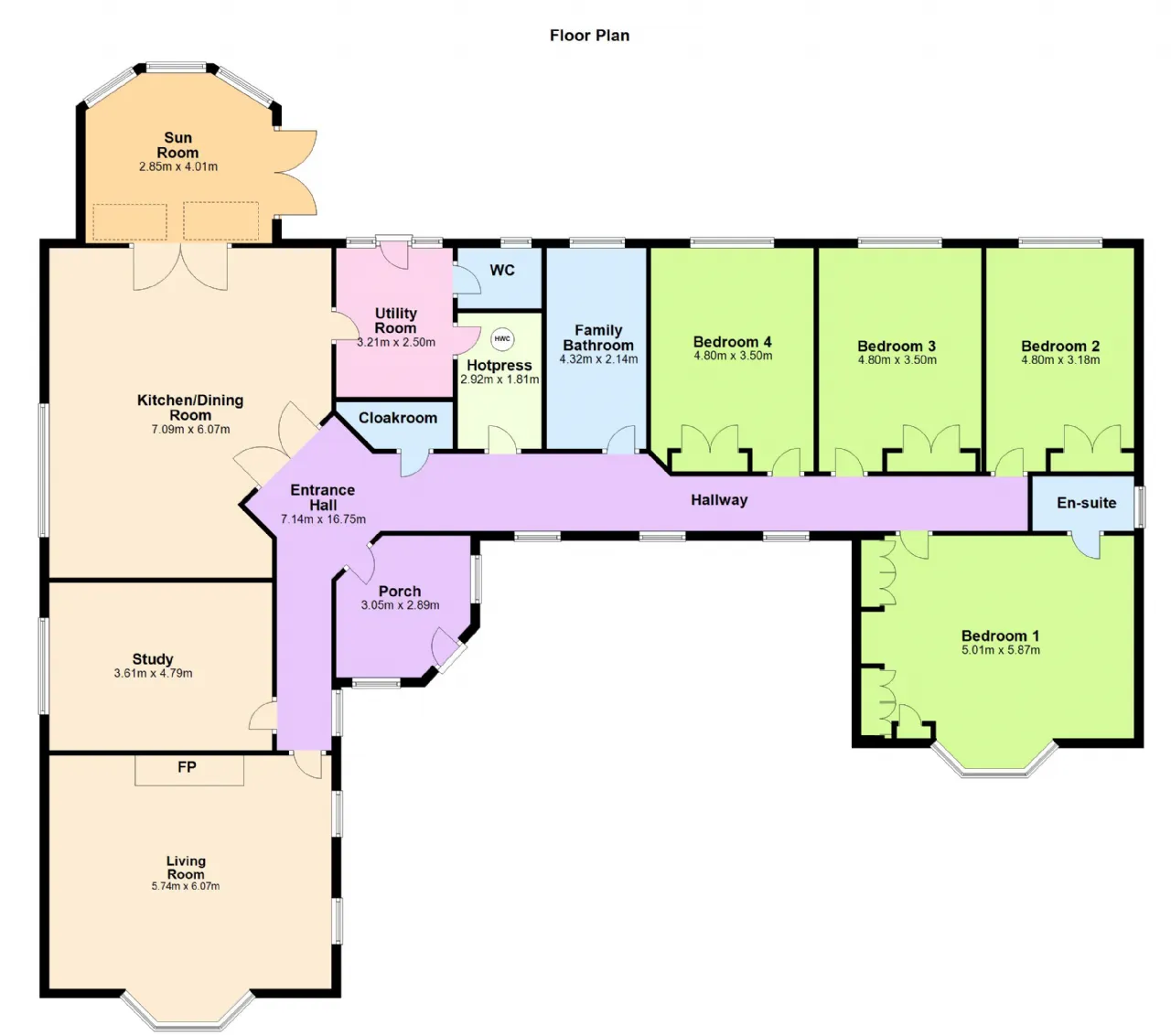 Entrance Hallway 7.14m x 16.75m with tiled & timber flooring & cloak press off same.