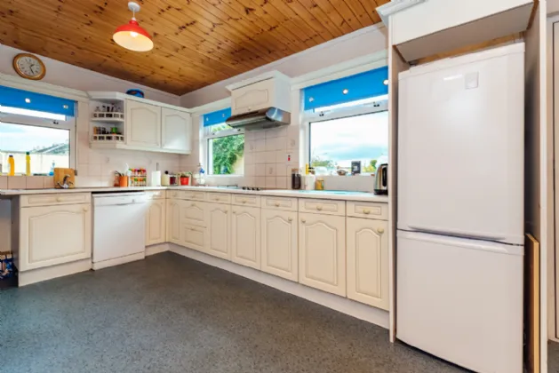 Kitchen Dining Room 5.1m x 3.2m With fitted white kitchen, Zanussi electric hob, Electrolux electric oven, Bosch dishwasher, Whirlpool washing machine, Beko fridge / freezer, vinyl flooring, tiled splash back, wooden ceiling, telephone point and rear door access