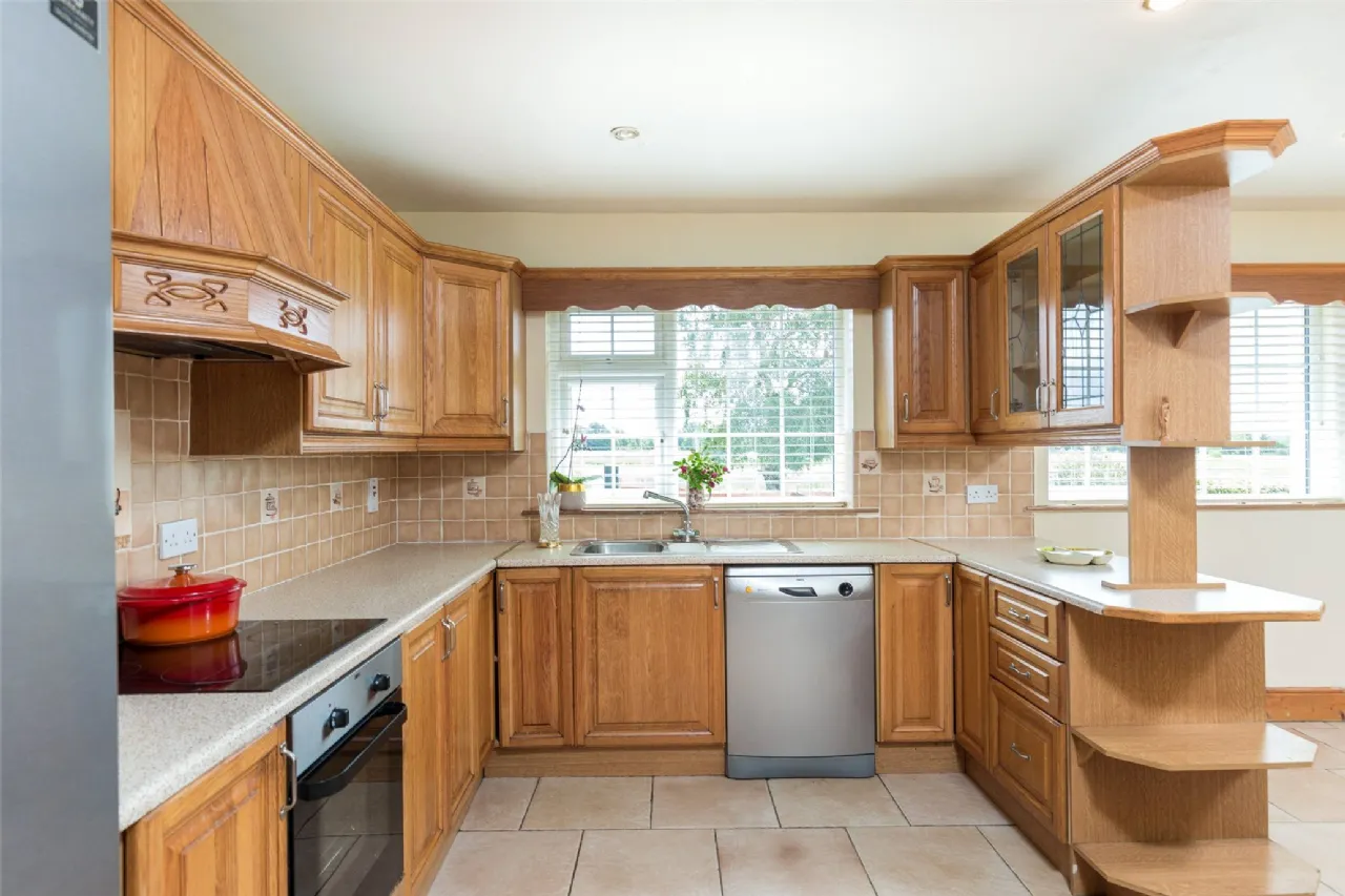 Kitchen/Diner 5.020 x 3.567 Fitted floor & wall units. Integrated appliances. Tiled floor & splashback. Wooden blinds.