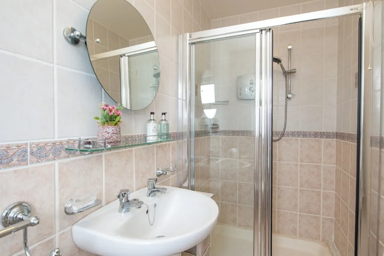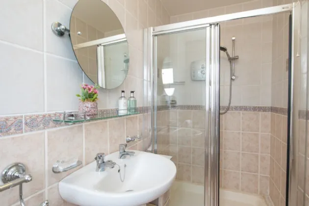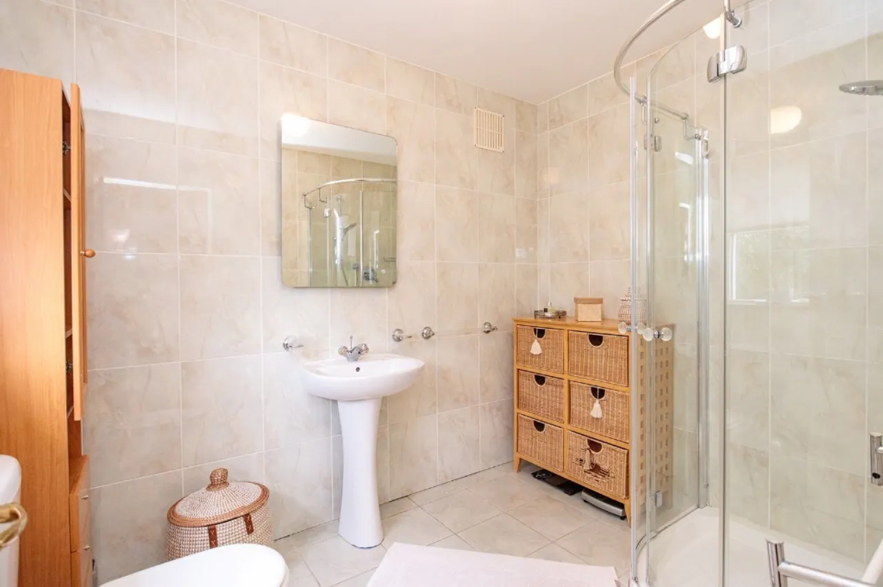 En-Suite 2.66 x 2.05 A well-appointed en suite featuring full wall-to-floor tiling and a gable end window providing natural light. The suite comprises an enclosed double shower cubicle with an electric shower, a WC, and a wash hand basin with a wall-mounted mirror above.