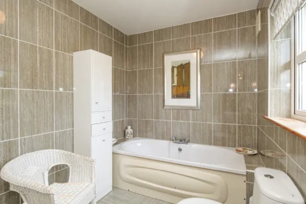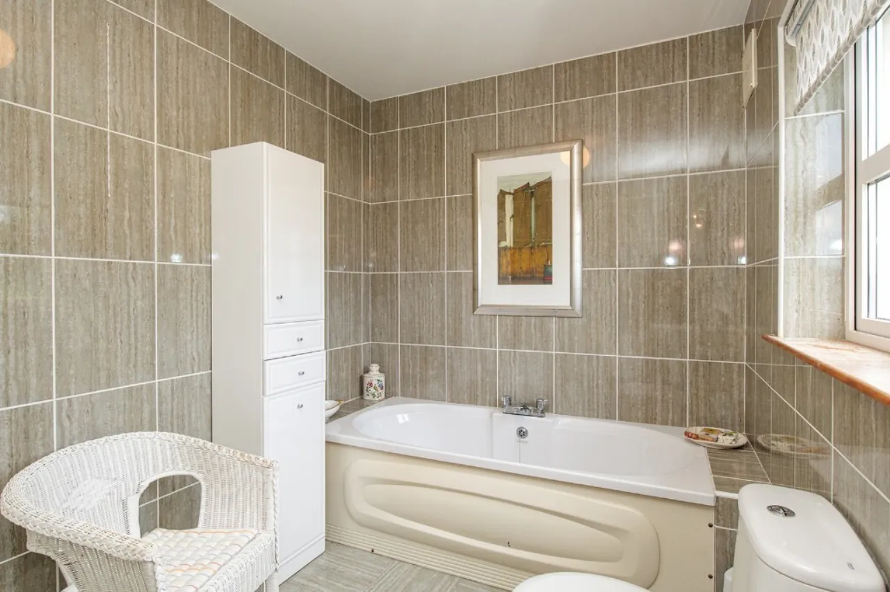 Bathroom 2.95 x 2.04 Step into a serene and stylish main bathroom, adorned with warm beige and light brown tiling from wall to floor. This inviting space features a classic white bathtub, a matching pedestal sink, and a sleek modern toilet. Above the sink, an oval mirror is flanked by two minimalist shelves, fitted blind.