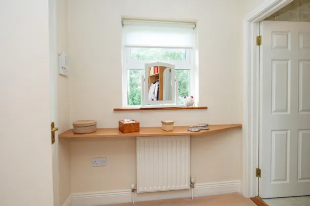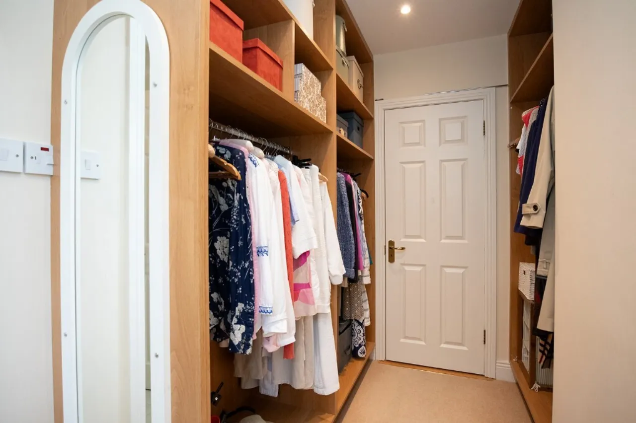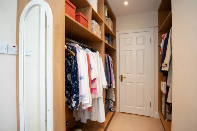 Dressing Room 3.17 x 1.92 A beautifully appointed dressing room featuring wall-to-wall wardrobes and custom shelving, seamlessly incorporating a discreet hot press. The space is thoughtfully designed with ample open and closed storage, complemented by a soft, fitted cream carpet that adds warmth and elegance.
