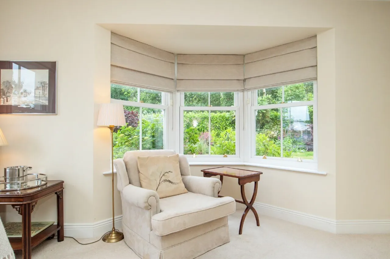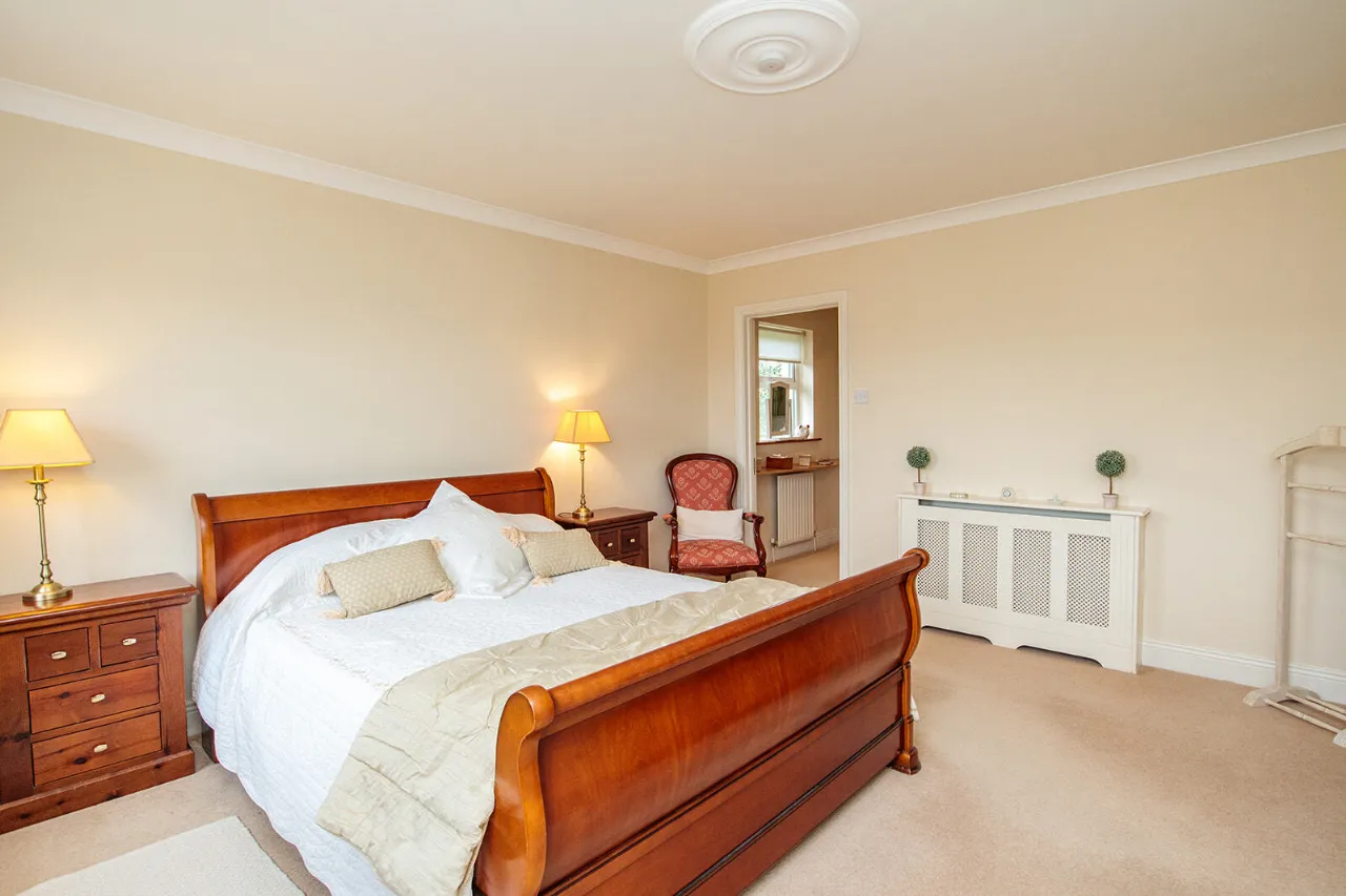 Master Bedroom 4.18 x 4.36 A generously proportioned master bedroom featuring a luxurious fitted cream carpet and elegant double sash windows at the front, allowing an abundance of natural light to flood the space. This bright and airy room is beautifully appointed with tasteful décor. Light beige walls and crown molding add a refined touch, while a central ceiling light fixture completes the serene and sophisticated ambiance.