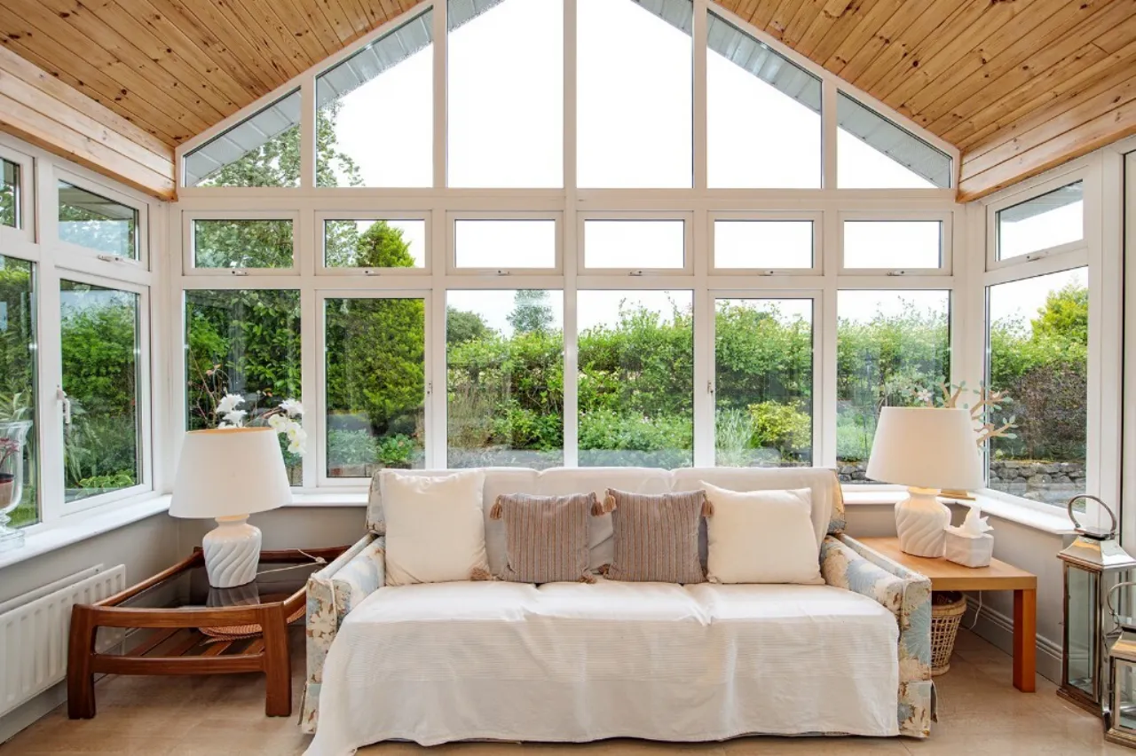 Sun Room 3.82 x 2.99 This charming sunroom features a warm pine ceiling and a tiled floor that adds a touch of rustic elegance. Surrounded by expansive windows on three sides, the room offers panoramic views of the beautifully landscaped gardens, flooding the space with natural light and creating a seamless connection to the outdoors. Patio doors provide direct access to the gardens. The space is ideal spot for relaxation or entertaining.