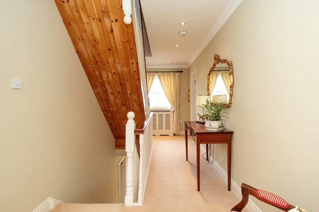 Landing (incl Stairs) 2.20 x 5.77 A bright and spacious landing area featuring a fitted cream carpet and a sash window to the front, flooding the space with natural light. The staircase, with elegant wooden paneling beneath, leads to the second floor. Recessed ceiling lights enhance the airy ambiance.